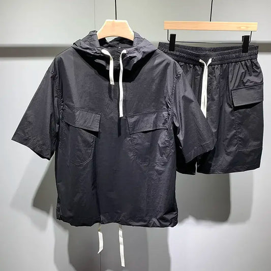 Summer Men's Athletic Short Sleeves Solid Sport Outfit Pocket Drawstring Hooded Casual Thin Short Sleeve Shirt&outdoor Shorts