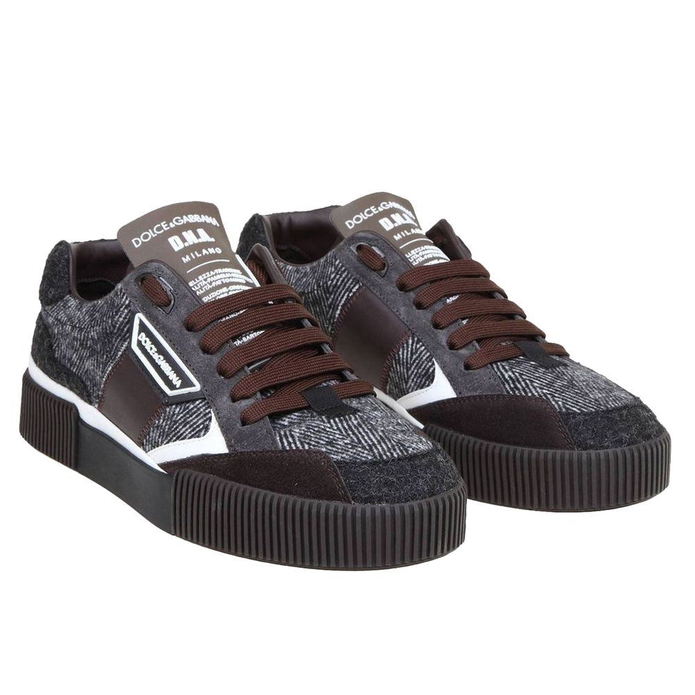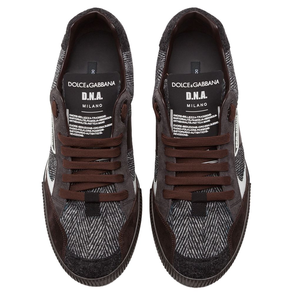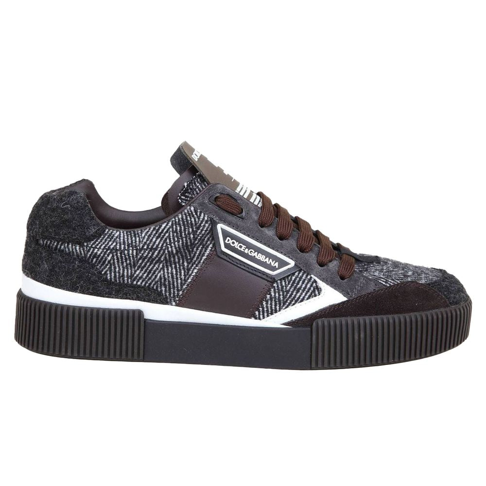 Dolce & Gabbana sneakers in black crevon fabric. Wool and leather details, brown flat laces, rubber sole with embroidered print on the undersole, rubber tongue with embossed logo