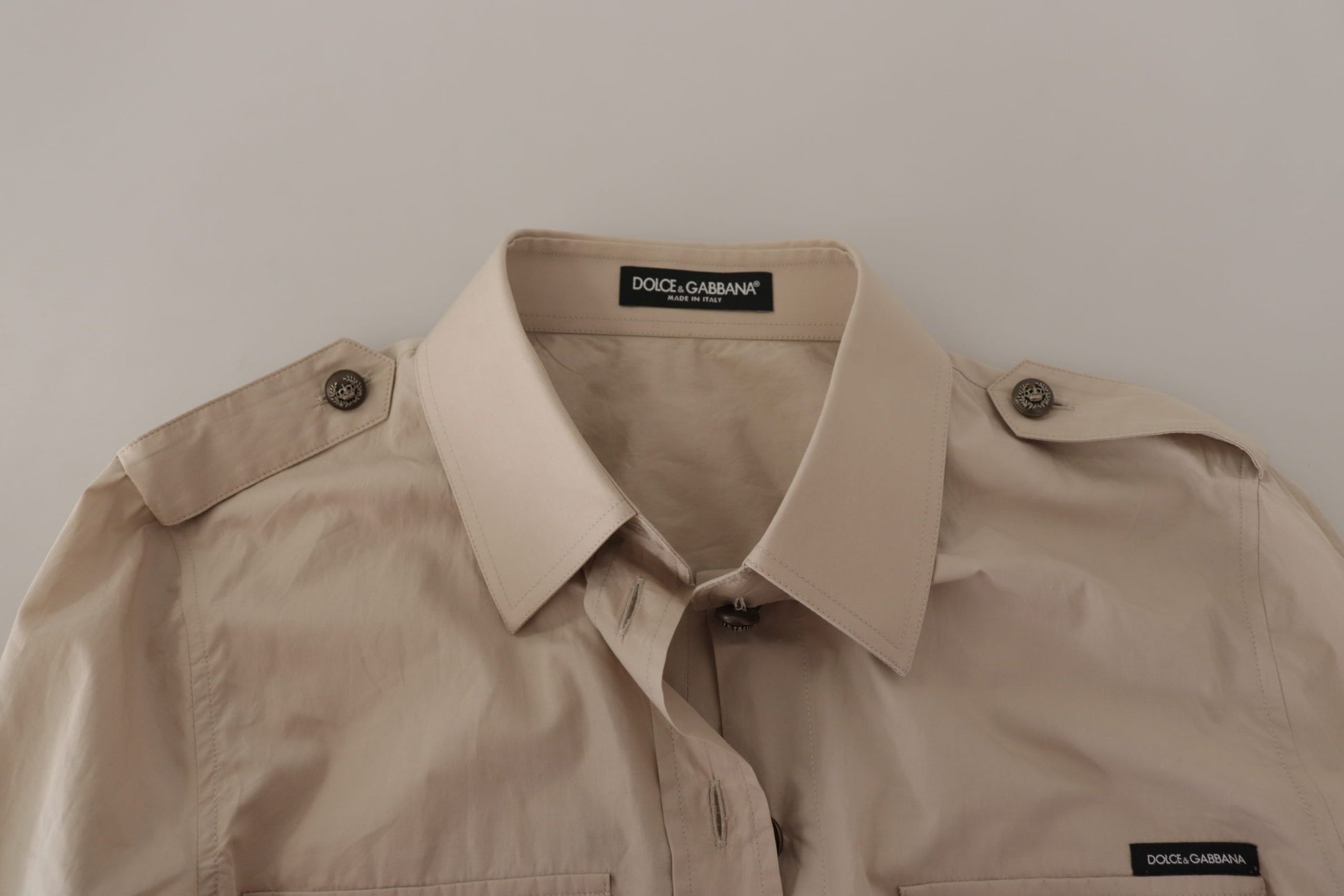 Indulge in the epitome of sophistication with our Gorgeous, brand new with tags, 100% Authentic Dolce & Gabbana shirt. This piece is a testament to classic style, boasting front pockets and long sleeves, finished in a sublime beige hue. Made in Italy, this shirt exemplifies craftsmanship and luxury in every thread.