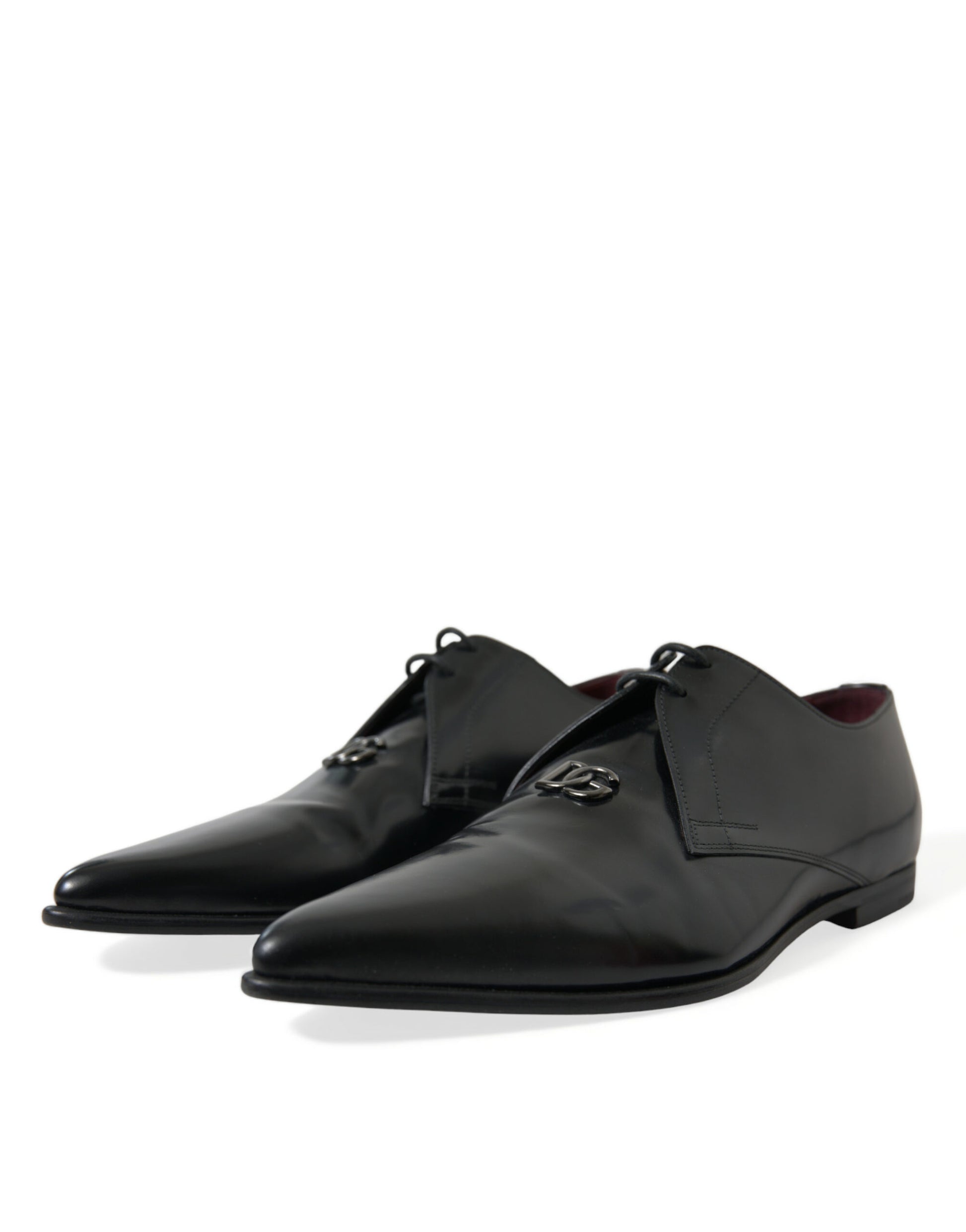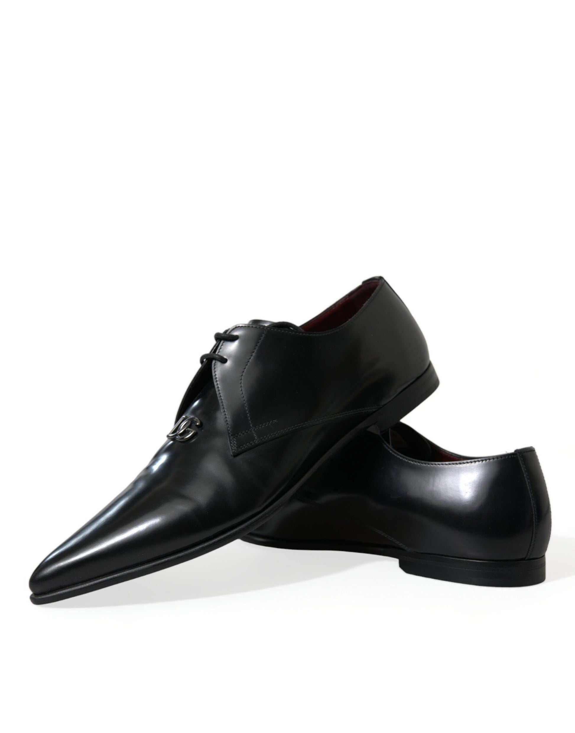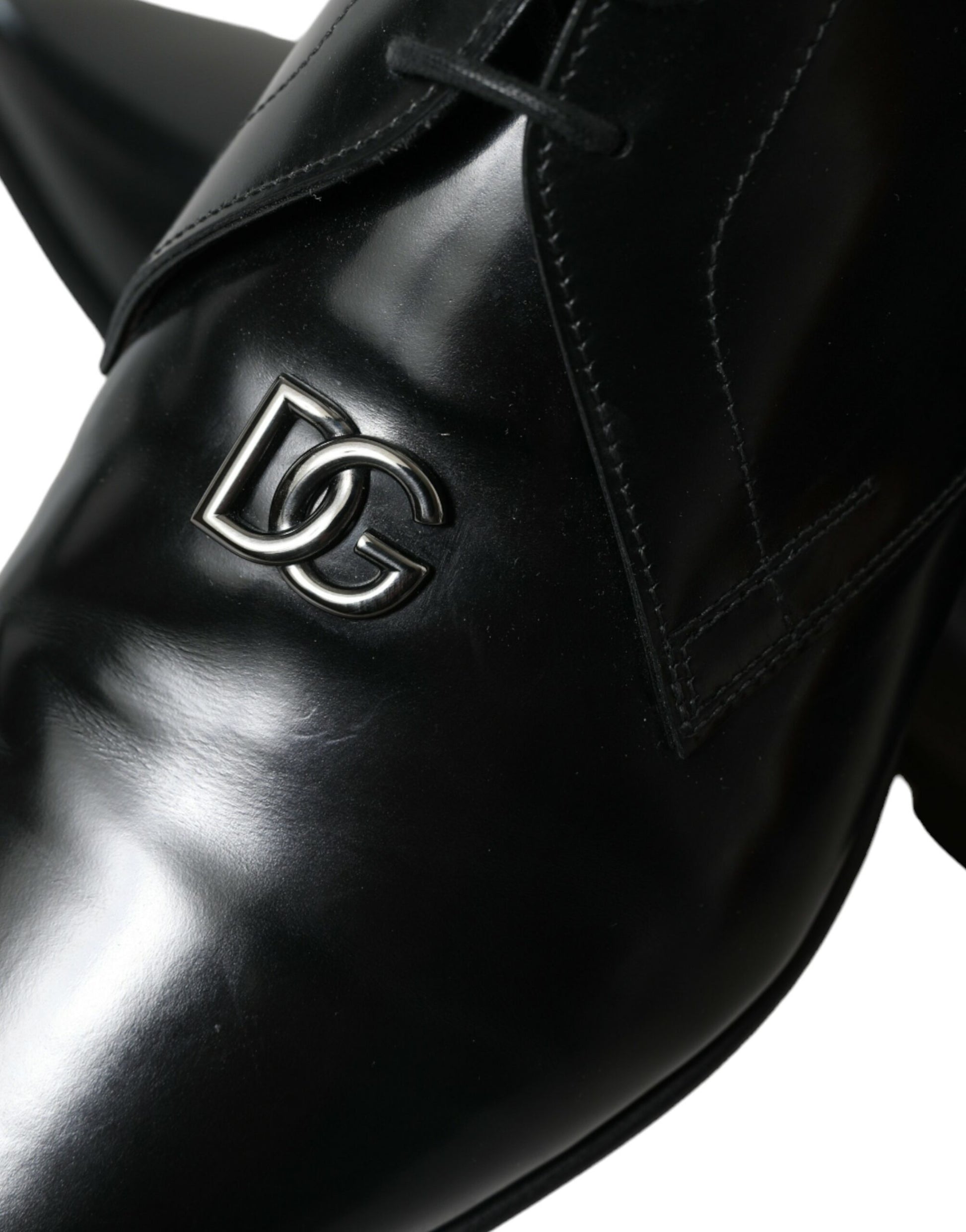 Elevate your style with these gorgeous Derby dress shoes, newly crafted with perfection by Dolce & Gabbana. Each pair boasts a sleek black finish, complemented by an exquisite metal DG logo, merging luxury with timeless design. Impeccably constructed from premium leather, these lace-up shoes are not just a statement of fashion, but a testament to high Italian craftsmanship. Perfect for formal events or adding a touch of sophistication to your office attire, they promise to be an exclusive addition to your wardrobe.