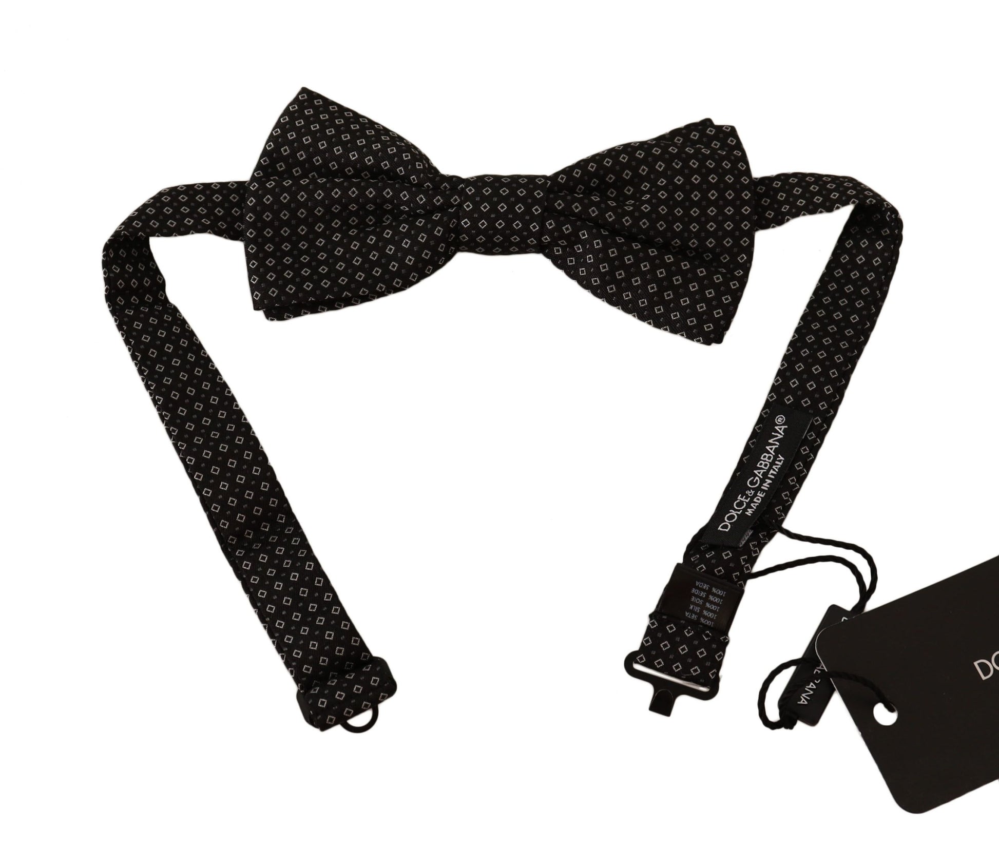 Indulge in the epitome of sartorial elegance with our latest Dolce & Gabbana bow tie. Crafted in Italy from the finest silk, this accessory conveys luxury and sophistication with its exquisite black patterned design. The tie features a unique metal clasp fashioned into a subtle hook on the rear, blending functionality with a hint of glamour — a testament to the brand’s attention to detail. This stunning piece arrives straight from Dolce & Gabbana’s exclusive collection, ready to elevate your formal ensemble.