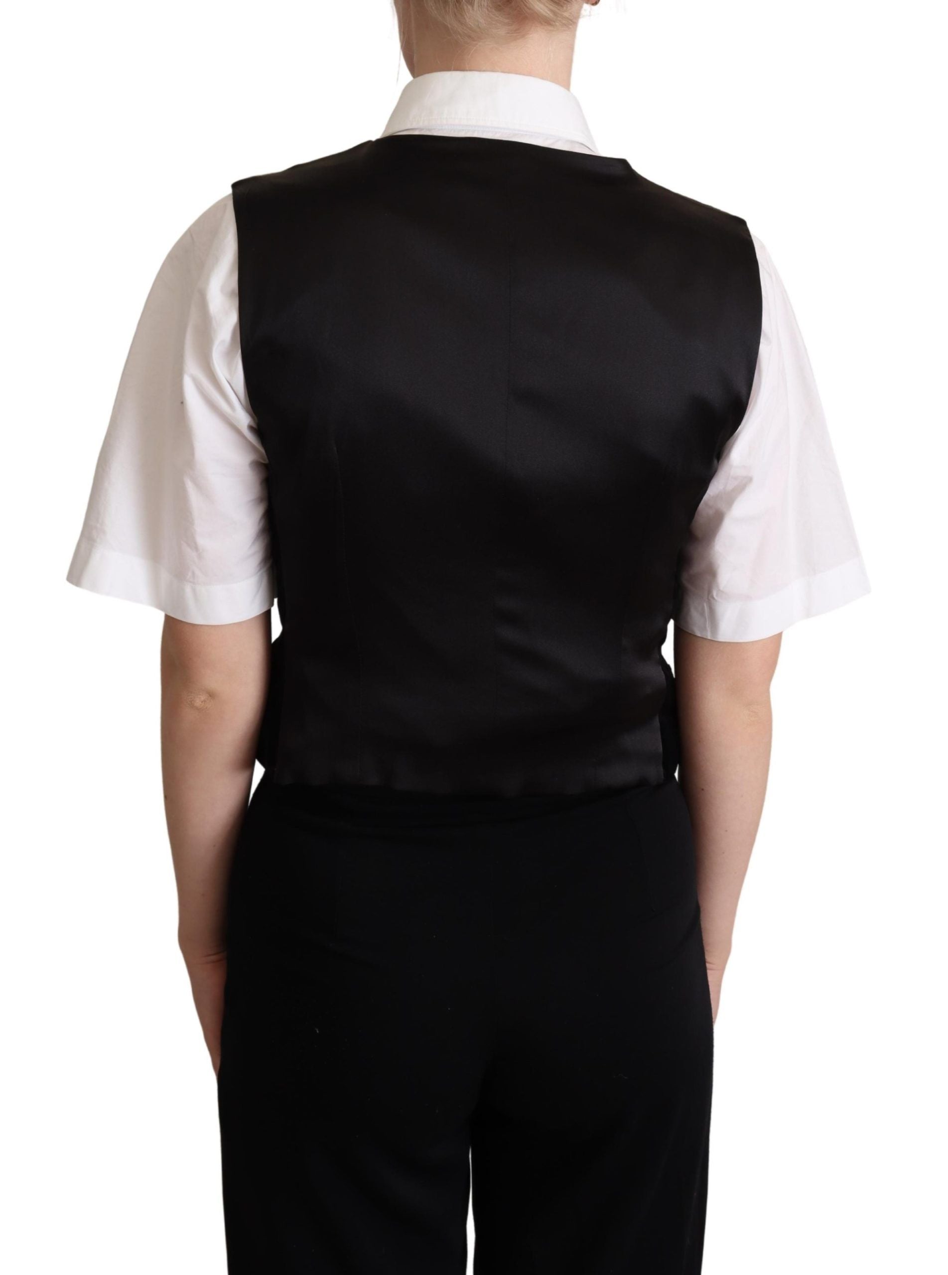 Indulge in the epitome of luxury with this exquisite black waistcoat by Dolce & Gabbana. Perfect for sophisticated layering, this vest showcases a sleek front button fastening that compliments any ensemble, whether it’s a casual affair or a formal event. Crafted from a sumptuous blend of cotton, silk, and a hint of elastane, this velvet piece offers both comfort and style.