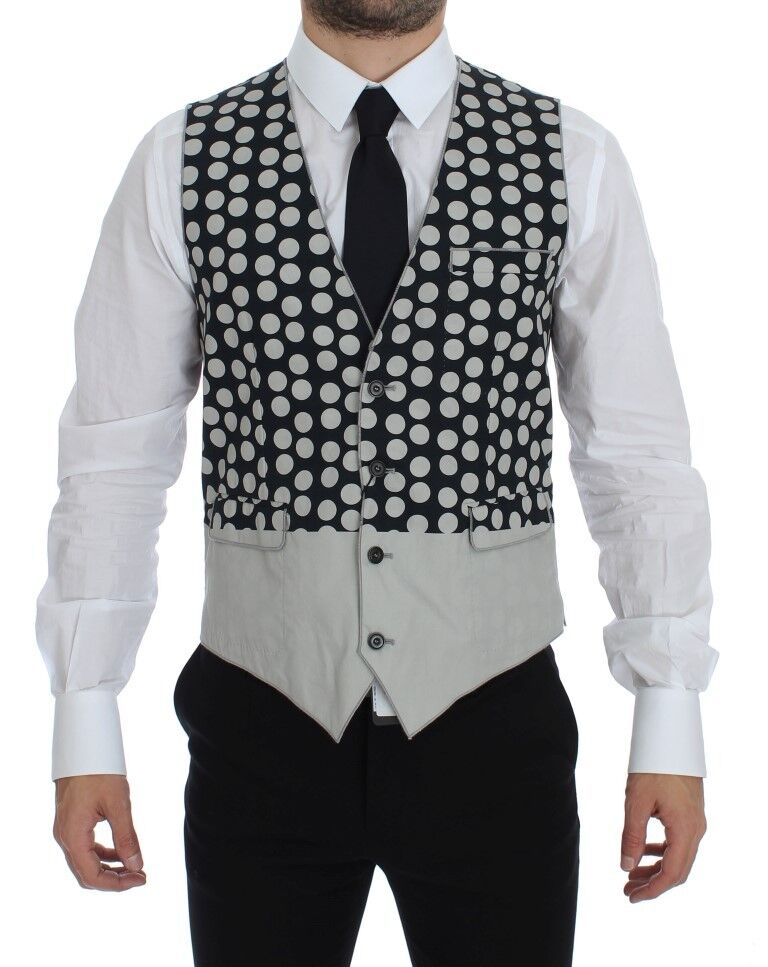 Step out in style with this stunning Dolce & Gabbana Blue Dress Vest, a premium addition from their exclusive MainLine collection. This brand new vest, complete with tags, boasts an eye-catching blue dotted pattern that is sure to turn heads. Tailored to perfection with a full front button closure and an adjustable back strap, it defines both comfort and elegance. Logo-engraved buttons add a touch of luxury, while the 100% cotton material and lining ensure a comfortable fit.