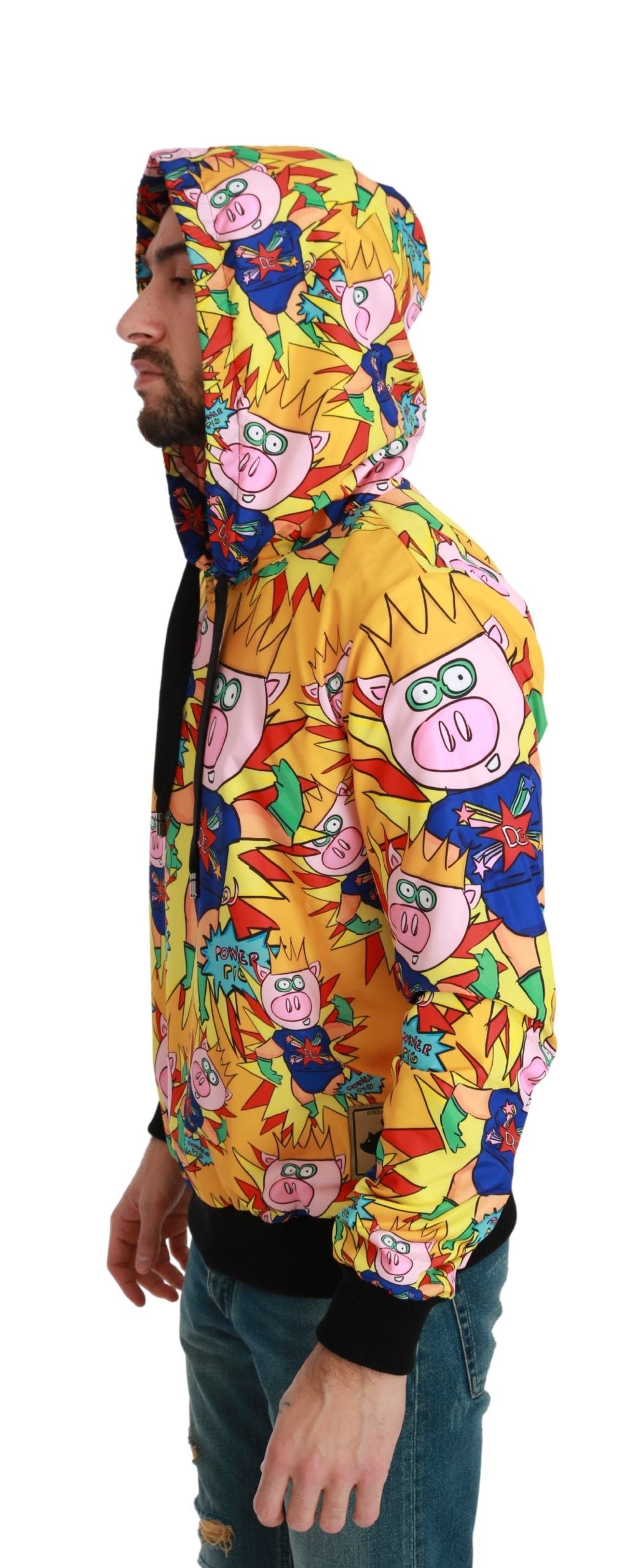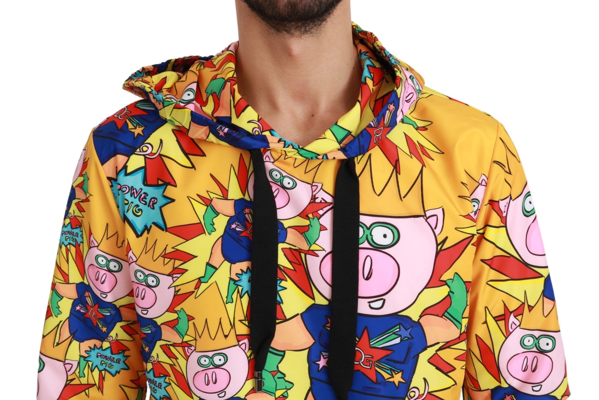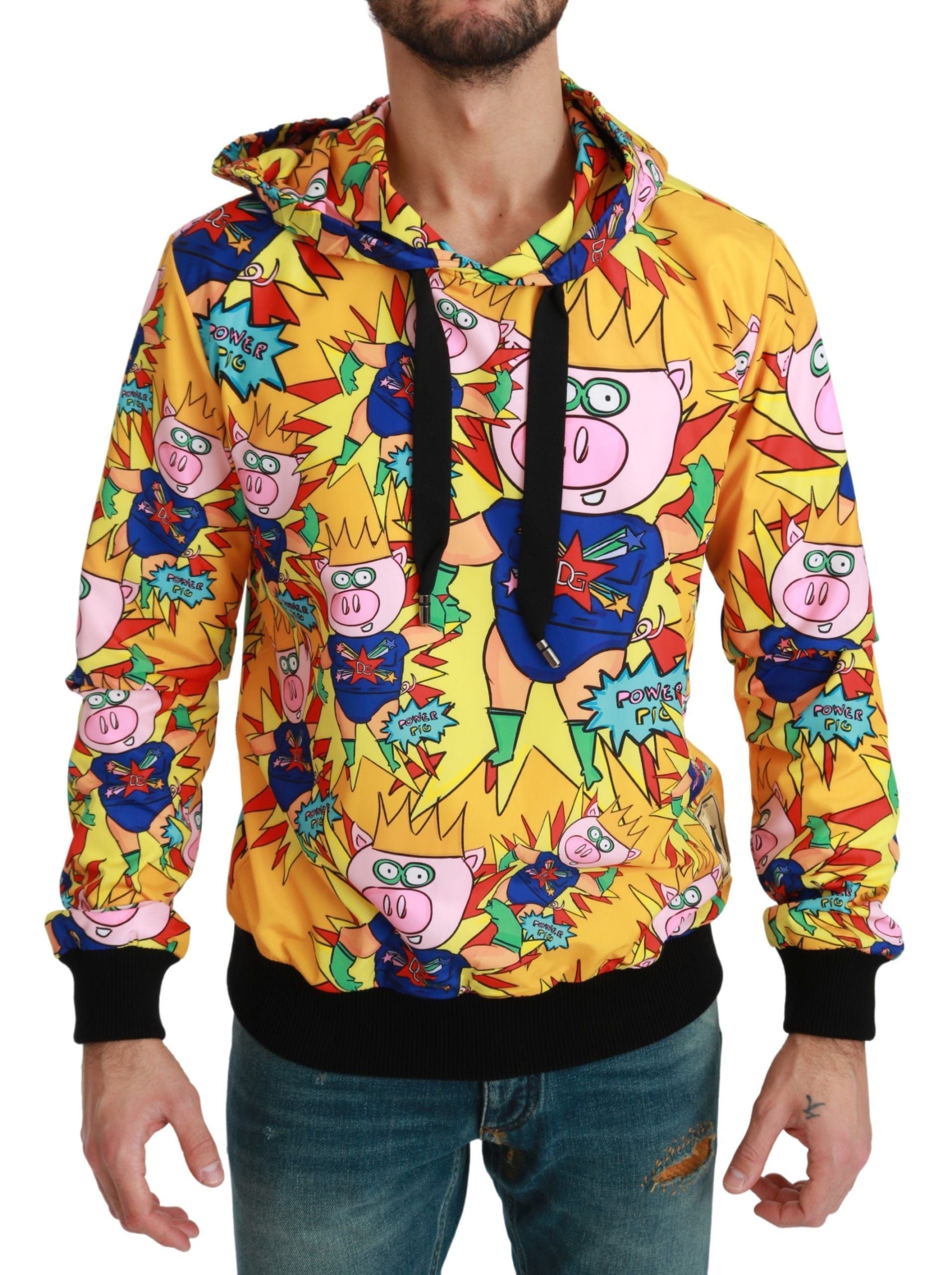 Experience luxury and comfort with this stunning Dolce & Gabbana hooded sweater, brand new with tags. Crafted from high-quality materials with meticulous Italian craftsmanship, this 2019 Year of the Pig, Family Collection piece features a regular fit and a vibrant yellow hue with a multicolored motif. Complete with two cozy outside pockets, a drawstring hood, and subtle logo details, it’s the perfect blend of fashion-forward style and practicality.