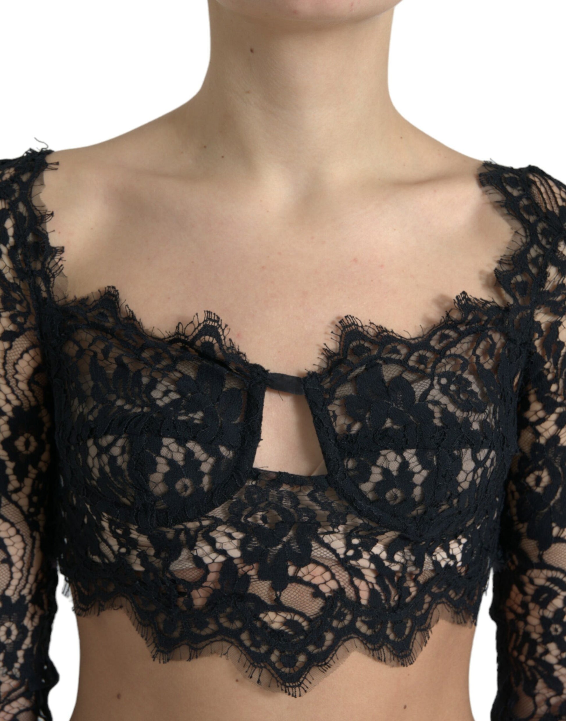 Introducing the epitome of luxury and sophistication by Dolce & Gabbana: a gorgeous, brand new lace bustier cropped top that is sure to turn heads. This stunning piece features long sleeves and is meticulously crafted with attention to detail, ensuring both comfort and style. Perfect for creating a bold statement, it comes equipped with a convenient back zipper closure and boasts the iconic logo details, all while being made in Italy, the heart of high fashion.