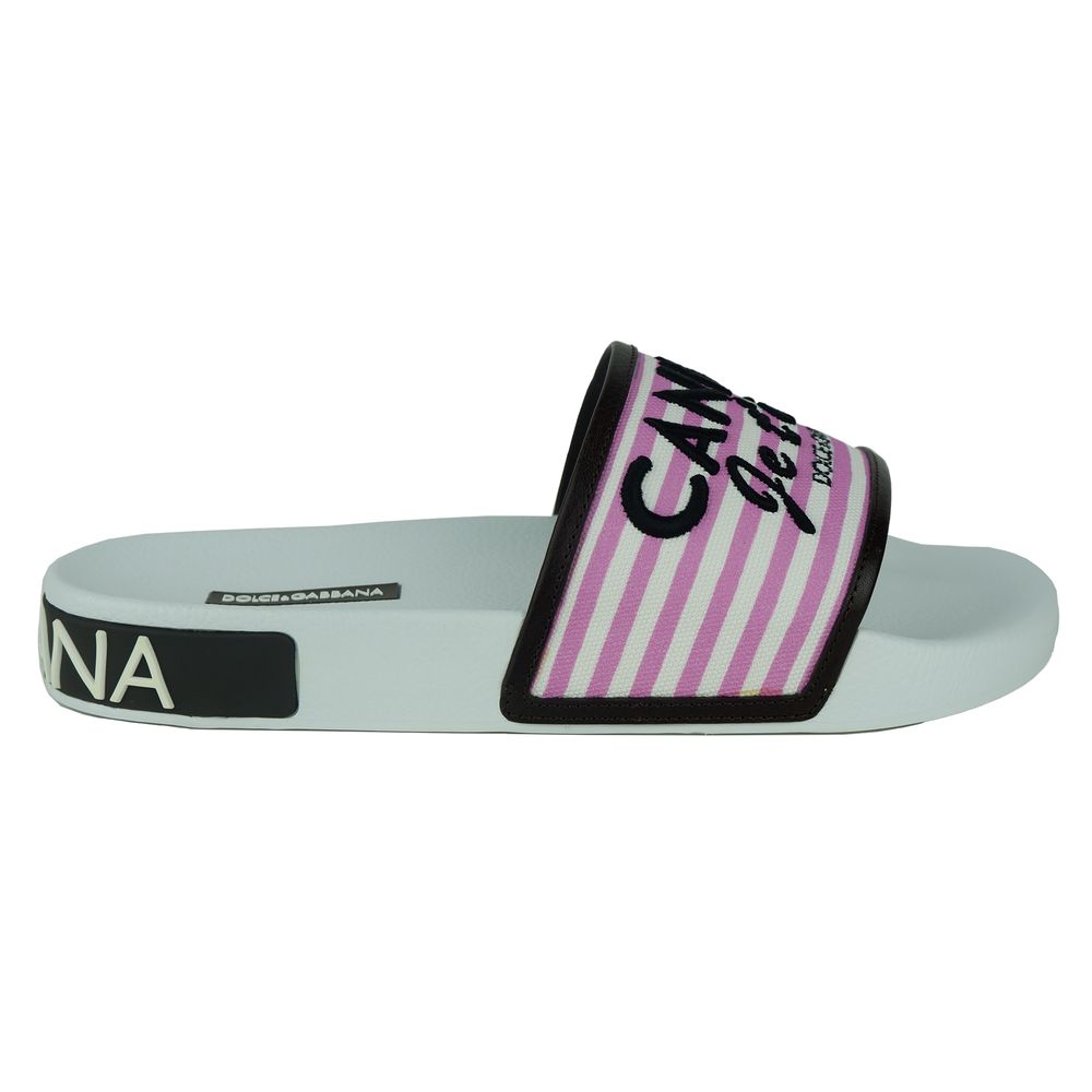 Indulge in the epitome of luxury with these exquisite white slippers from Dolce & Gabbana. Crafted with a blend of high-quality materials, these slippers feature a durable rubber sole, a canvas upper accented with refined calfskin leather details, lending a touch of elegance to your casual wear. Perfectly constructed in Italy, these sandals offer both supreme comfort and style.