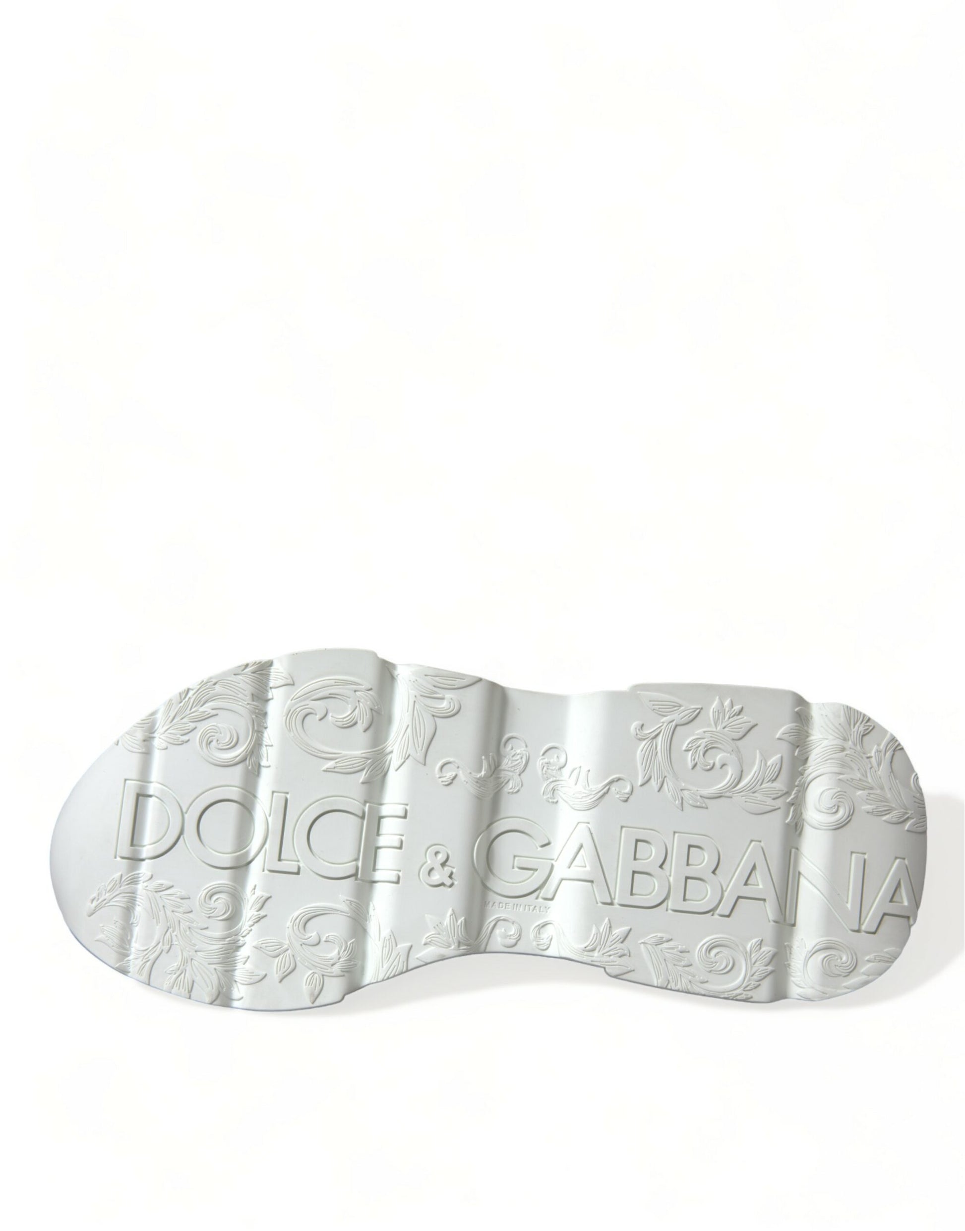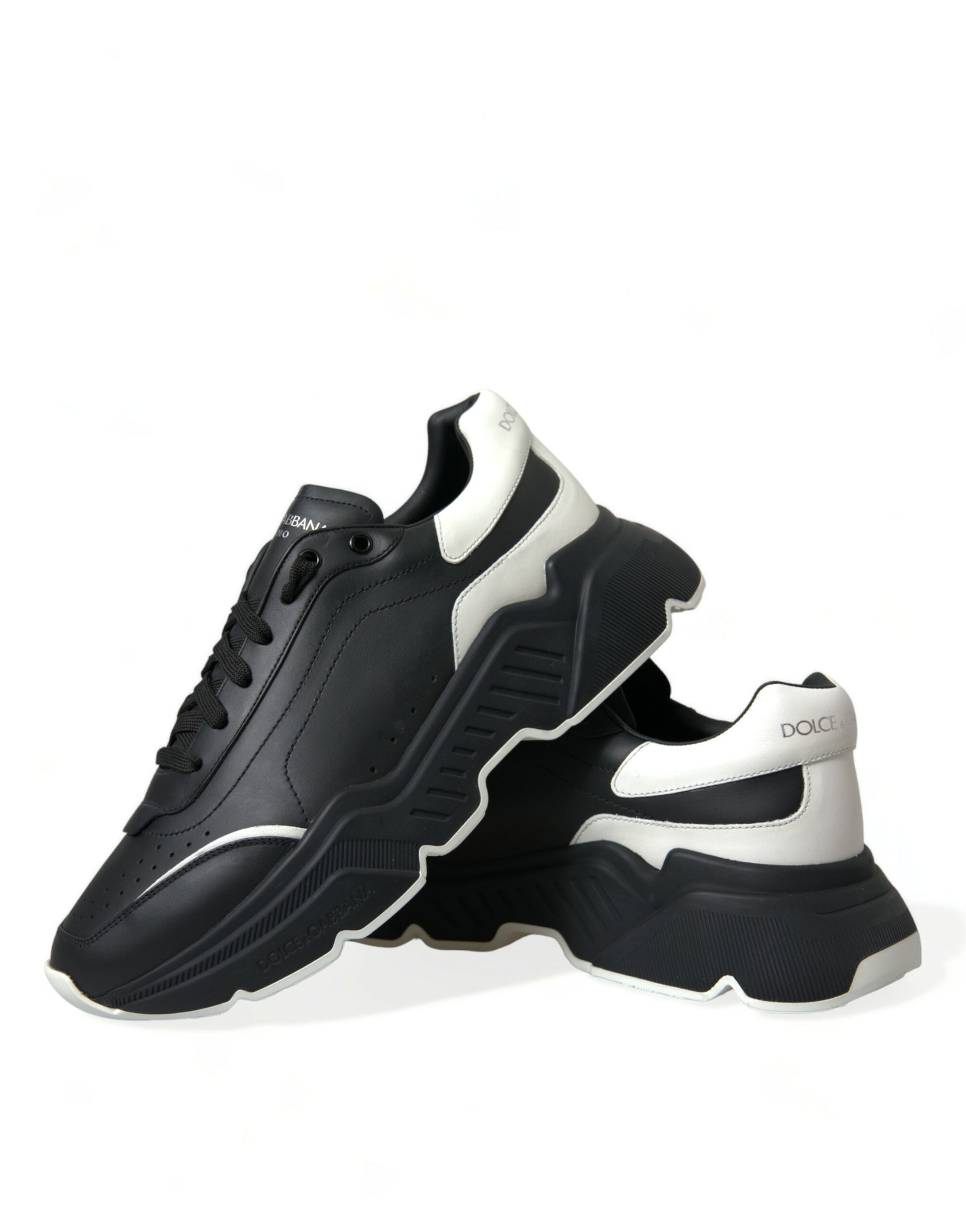 Step up your sneaker game with these luxurious Dolce & Gabbana Daymaster platform sneakers. A perfect blend of style and comfort, these shoes feature a sleek black nappa calfskin upper complemented by a contrasting white heel. The iconic logo embellishment adds a touch of elegance, while the black flat laces ensure a snug fit. Designed in Italy, these sneakers boast an extralight rubber sole that promises durability and ease with every stride. Their exclusive design and superior craftsmanship make them an exceptional addition to any wardrobe.