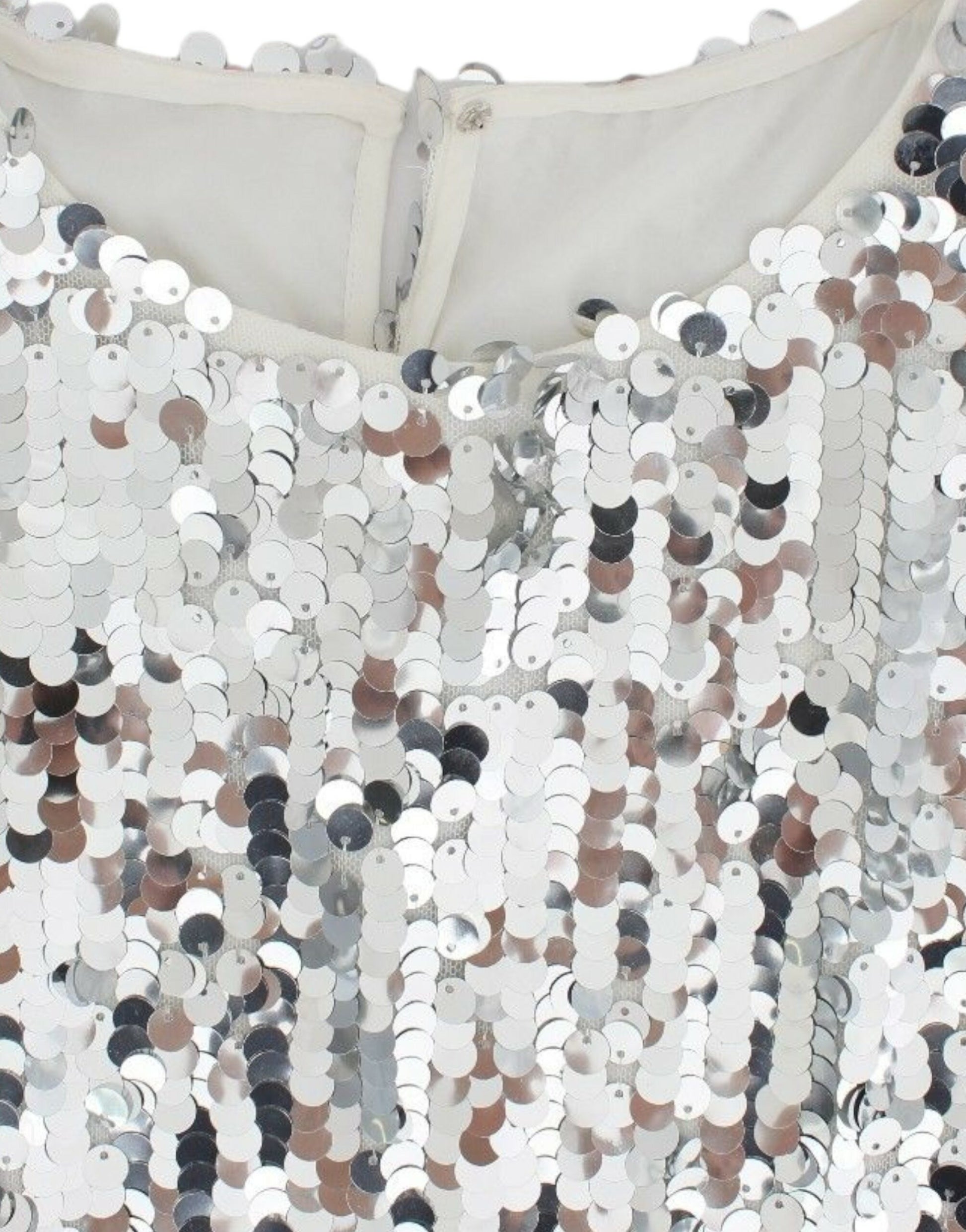 Discover the epitome of elegance with our Enchanted Sicily Sequined Evening Blouse. This 100% Authentic, gorgeous blouse is a stand-out piece perfect for any gleaming soirée. Designed with intricate silver sequins on a pristine white backdrop, it features a chic back button opening and the luxurious touch of logo details, all crafted with Italian finesse by Dolce & Gabbana.