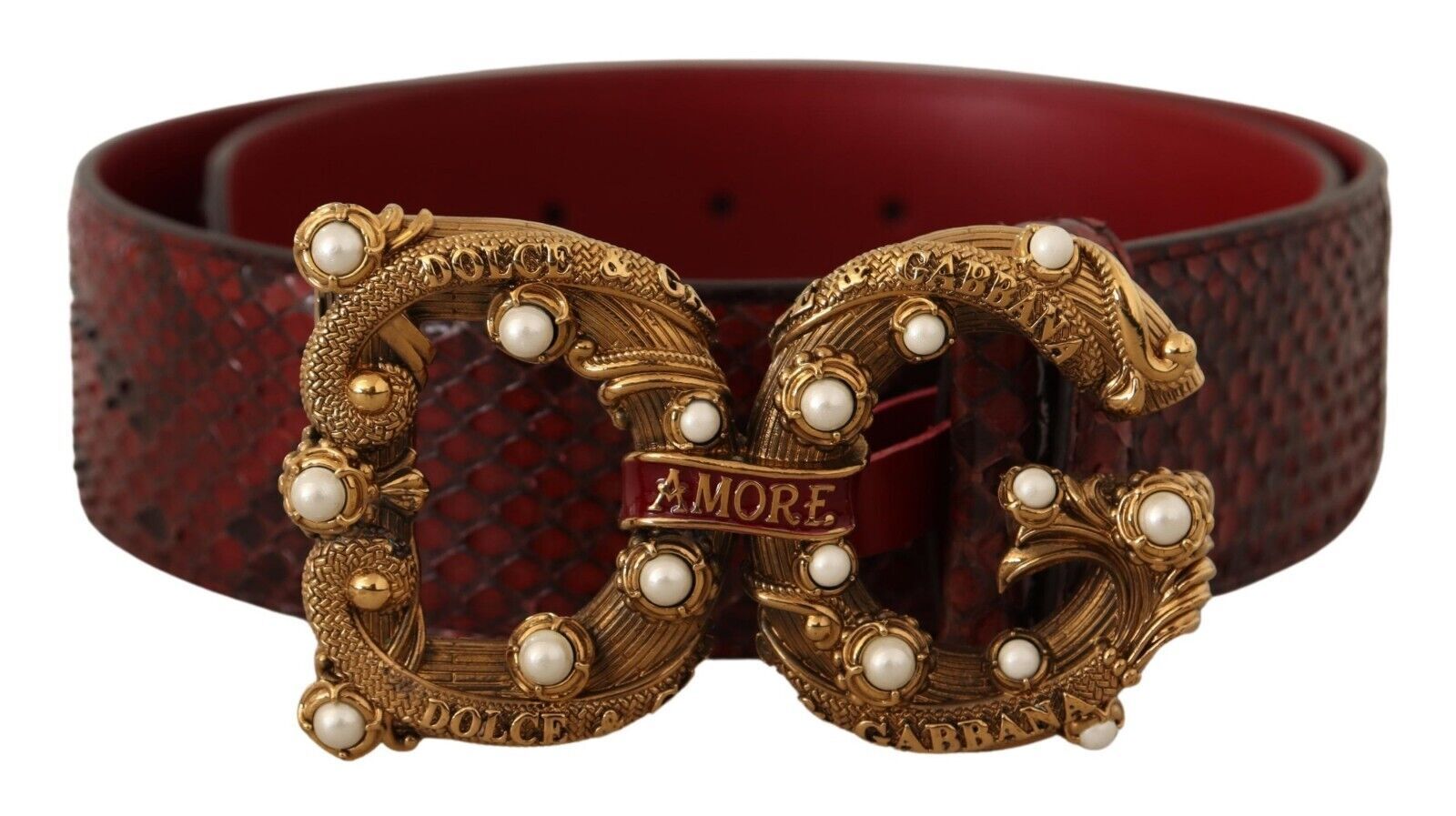 Discover elegance and sophistication with our Dolce & Gabbana women’s belt. Impeccably crafted from exotic python skin and premium leather, this stunning accessory is sure to turn heads. The striking red hue provides a bold statement, while the vintage brass logo buckle is adorned with an enameled red scroll and glossy artificial pearls, adding a touch of refined opulence to your ensemble.