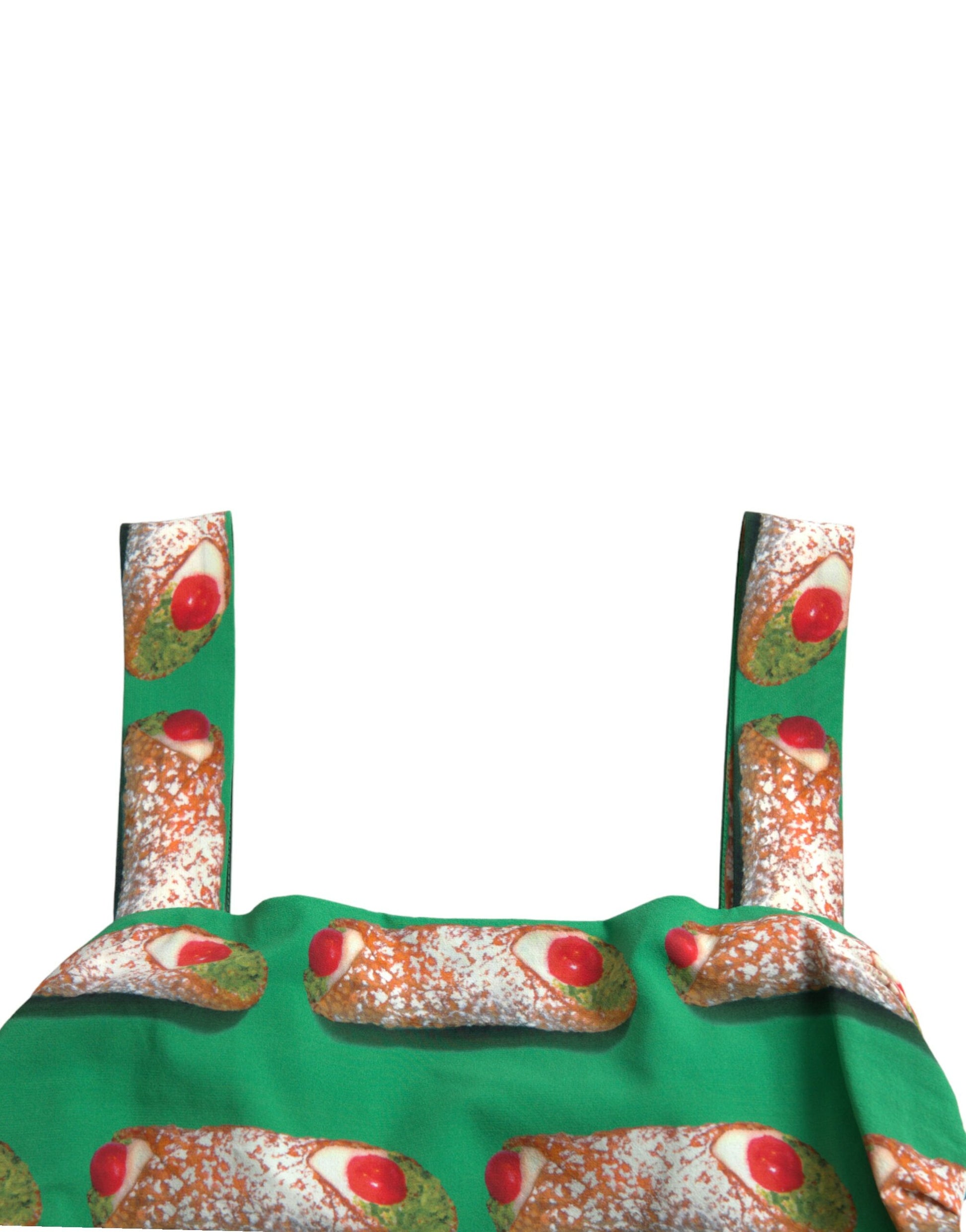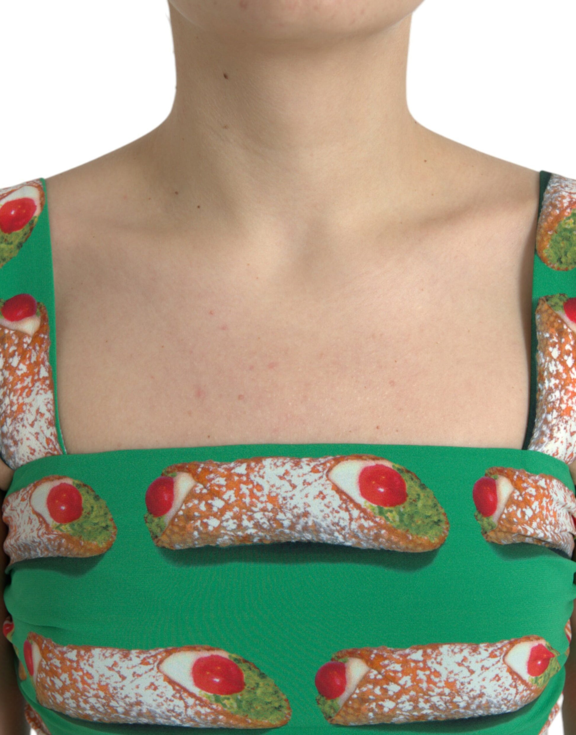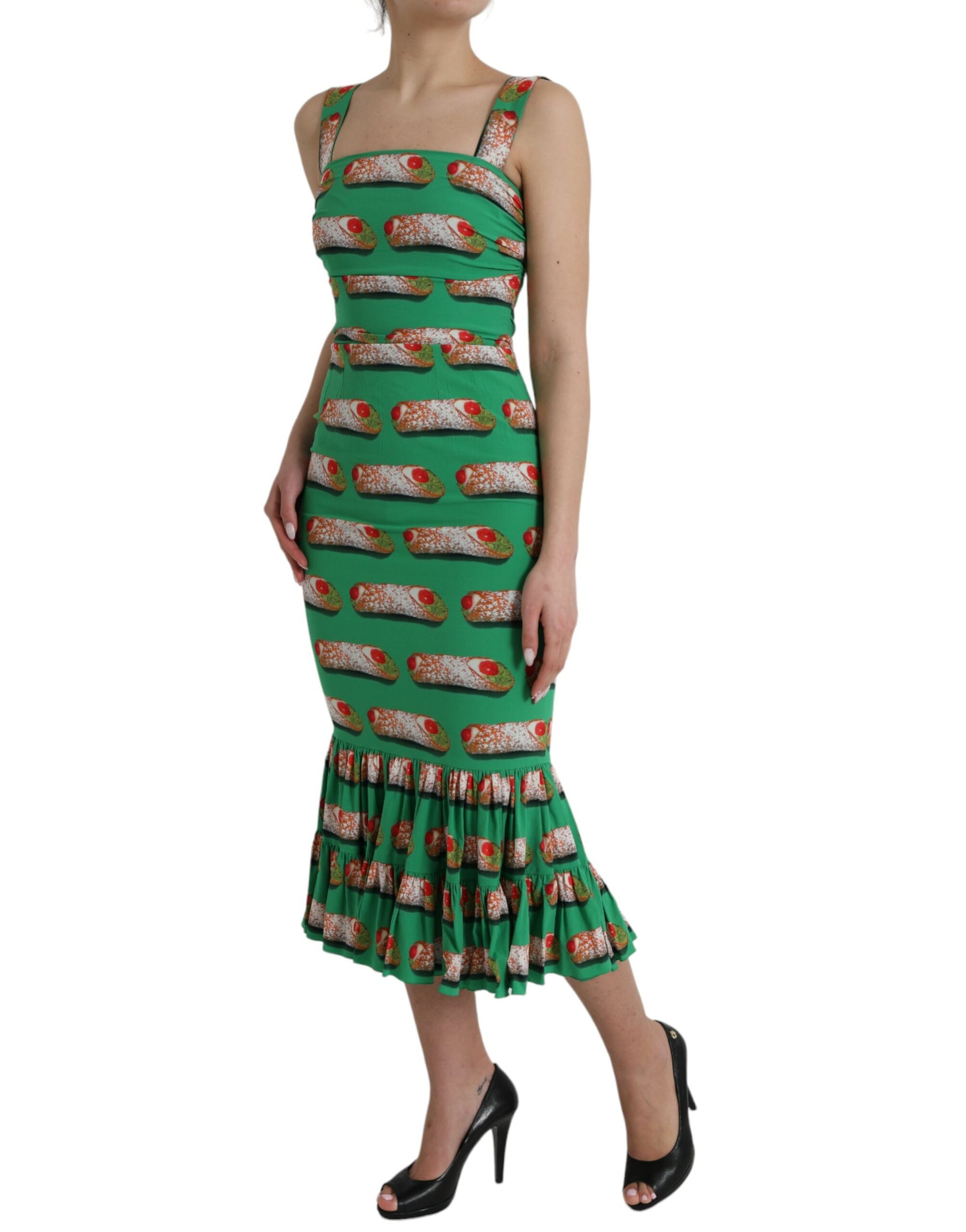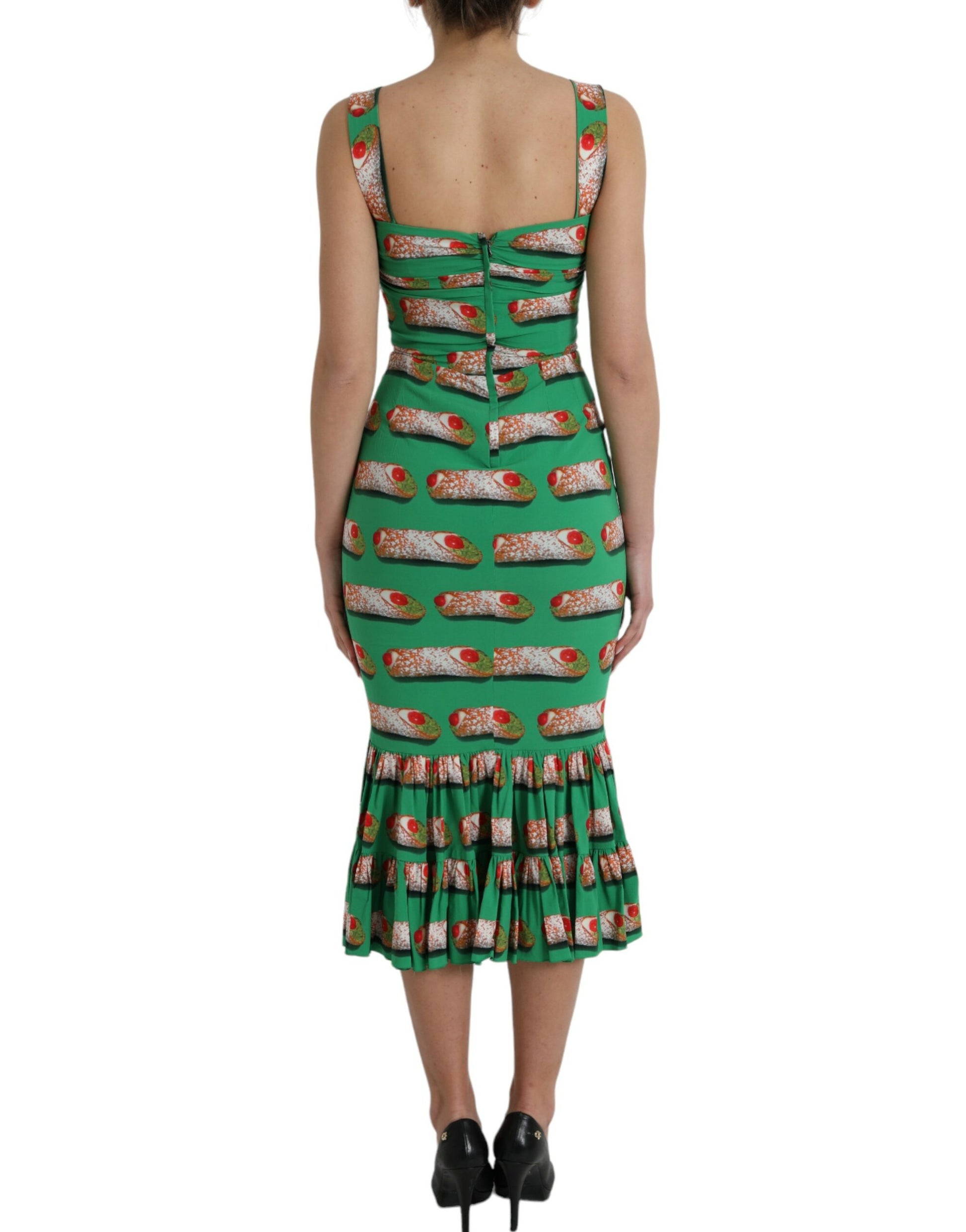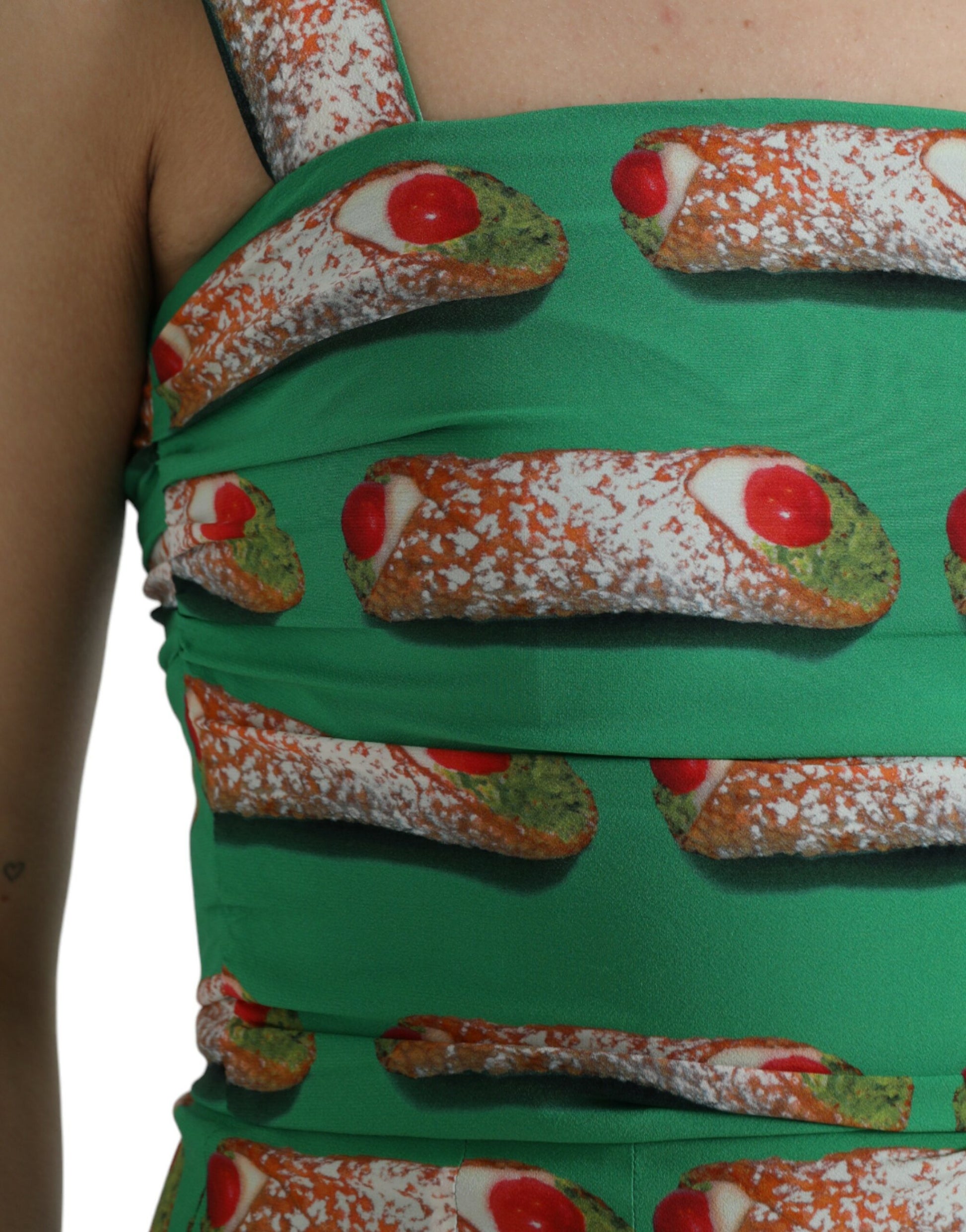 Dolce & Gabbana Green Cannoli Print Silk Ruched Midi Dress