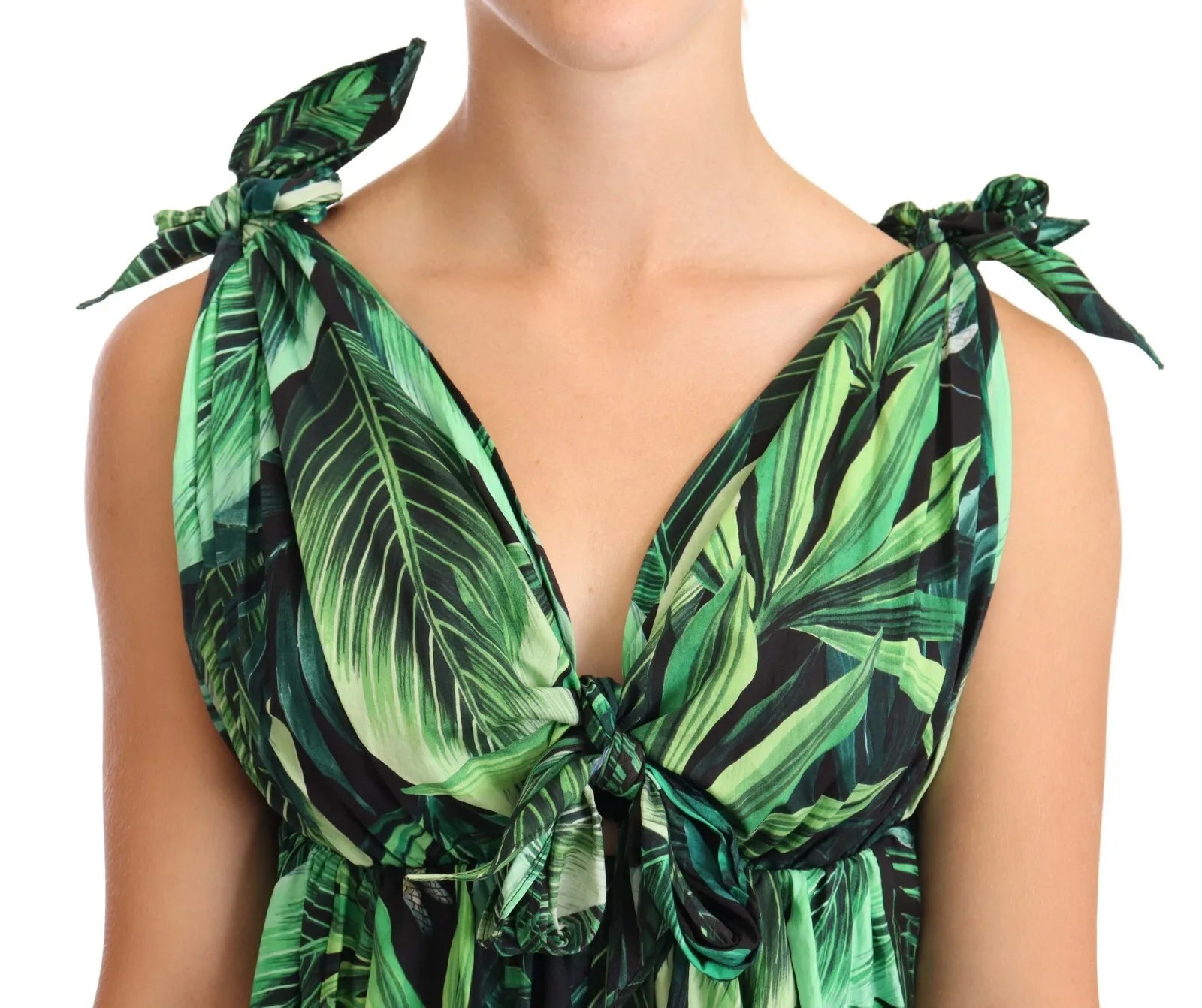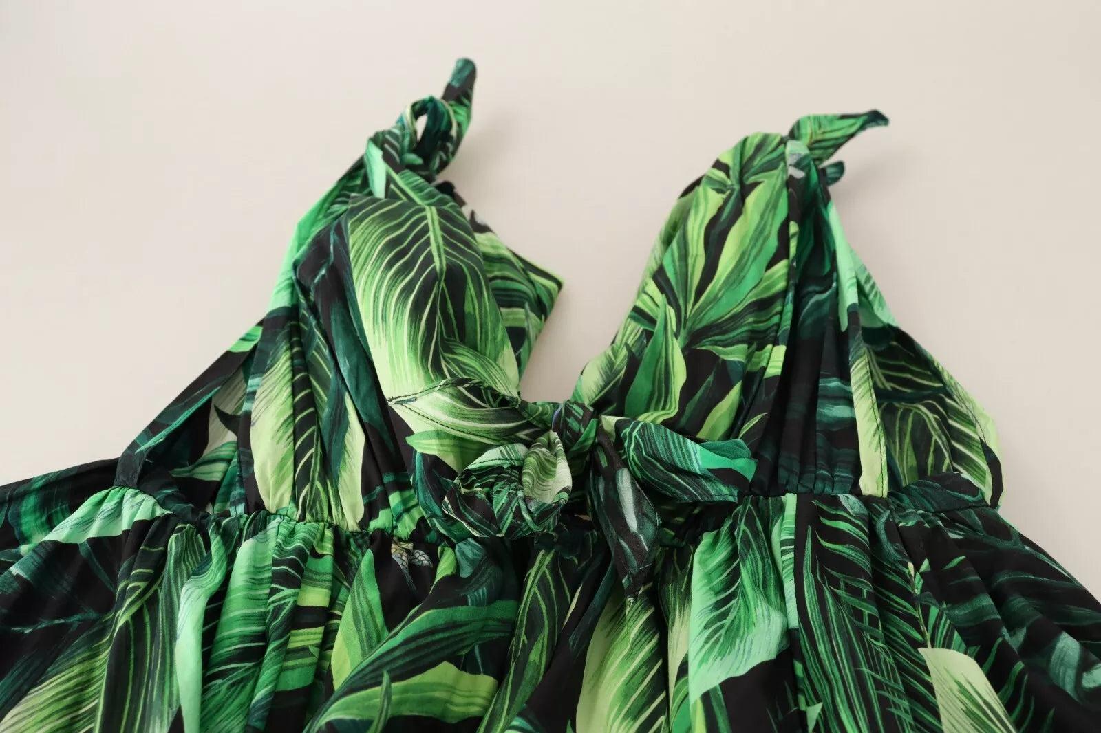 Dolce & Gabbana Green Leaves Print Cotton Flared Mini Dress