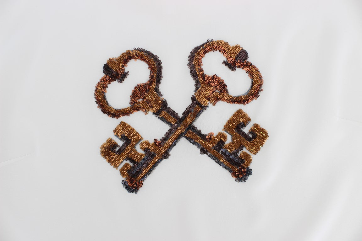 Indulge in the epitome of high-fashion with this stunning ivory silk blouse from the exclusive MainLine of Dolce & Gabbana. Adorned with eye-catching orange sequined key detailing, this top radiates elegance with a touch of whimsy. The luxurious 100% silk fabric ensures a smooth and lustrous finish, making this blouse a perfect choice for sophisticated evenings or high-profile events.