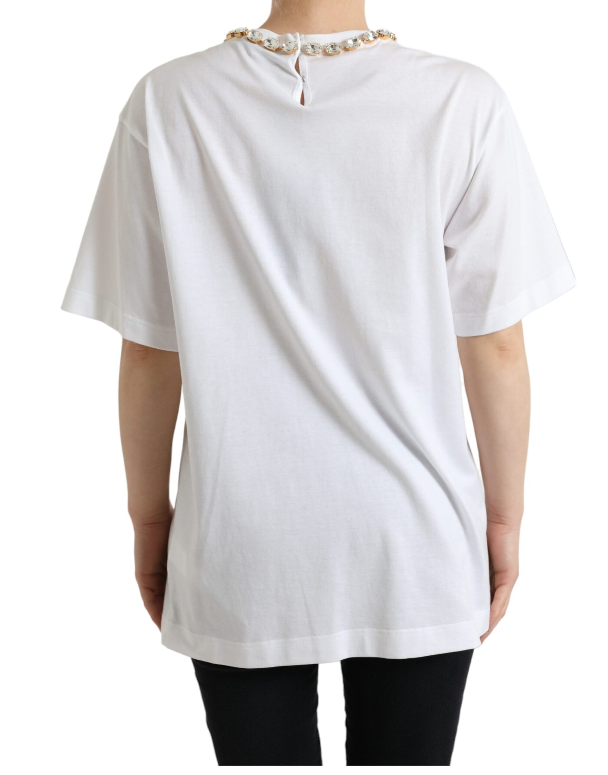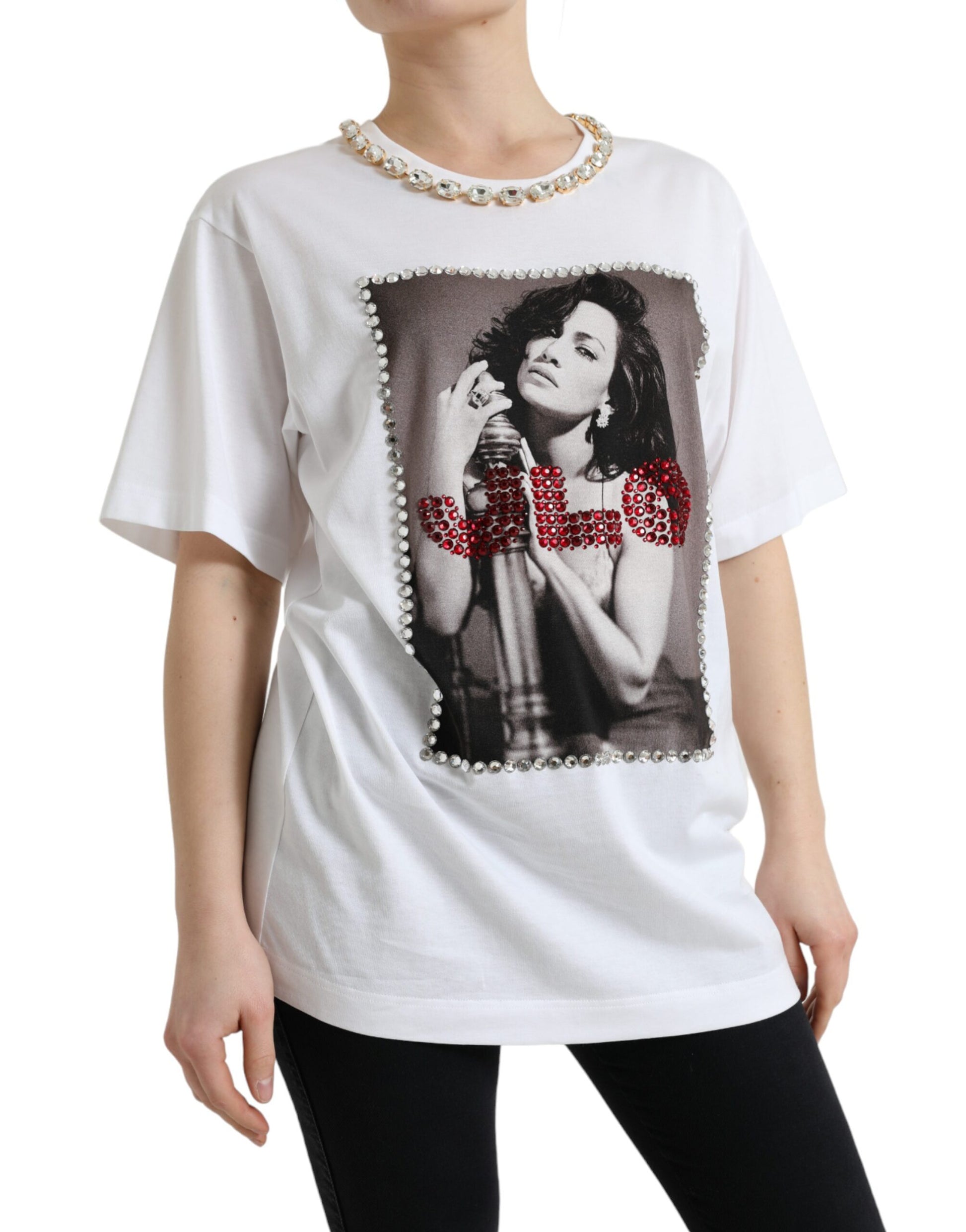 Elevate your wardrobe with this exquisite Dolce & Gabbana piece. A testament to Italian craftsmanship and high fashion, this pristine white t-shirt boasts a striking J.Lo photograph print complemented by sparkling crystal embellishments. Its classic crew neck and short sleeve design make it a versatile addition to any ensemble. Created for those who adore a touch of celebrity glamour in their style repertoire.