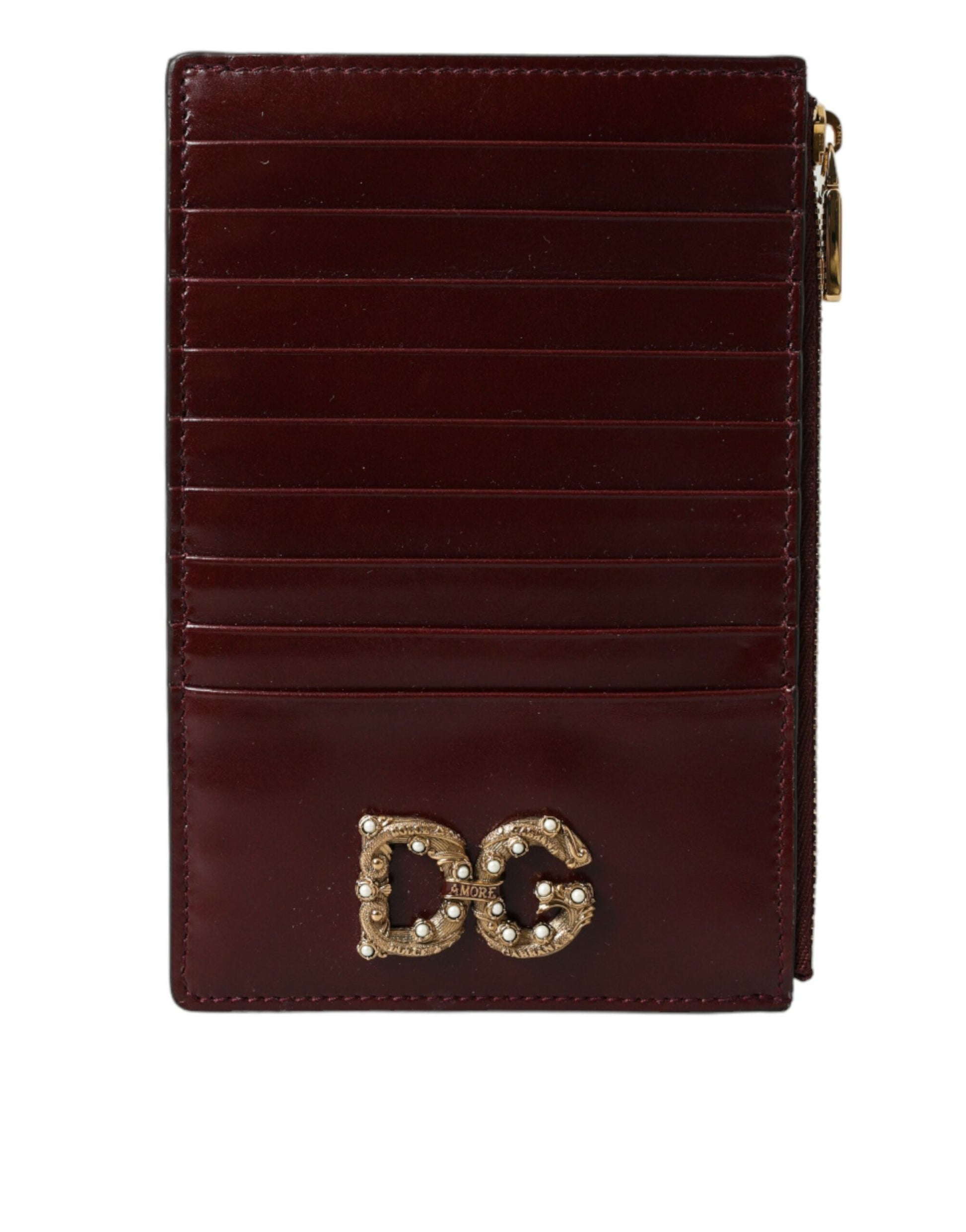 Step up your accessory game with this authentic Dolce & Gabbana card holder, an epitome of elegance and functionality. Made from premium leather in a rich maroon hue, this wallet is not just a carrier for your cards but a statement of luxurious style. With a secure zipper closure and multiple card slots, it unites convenience with the classic DG metal logo charm.