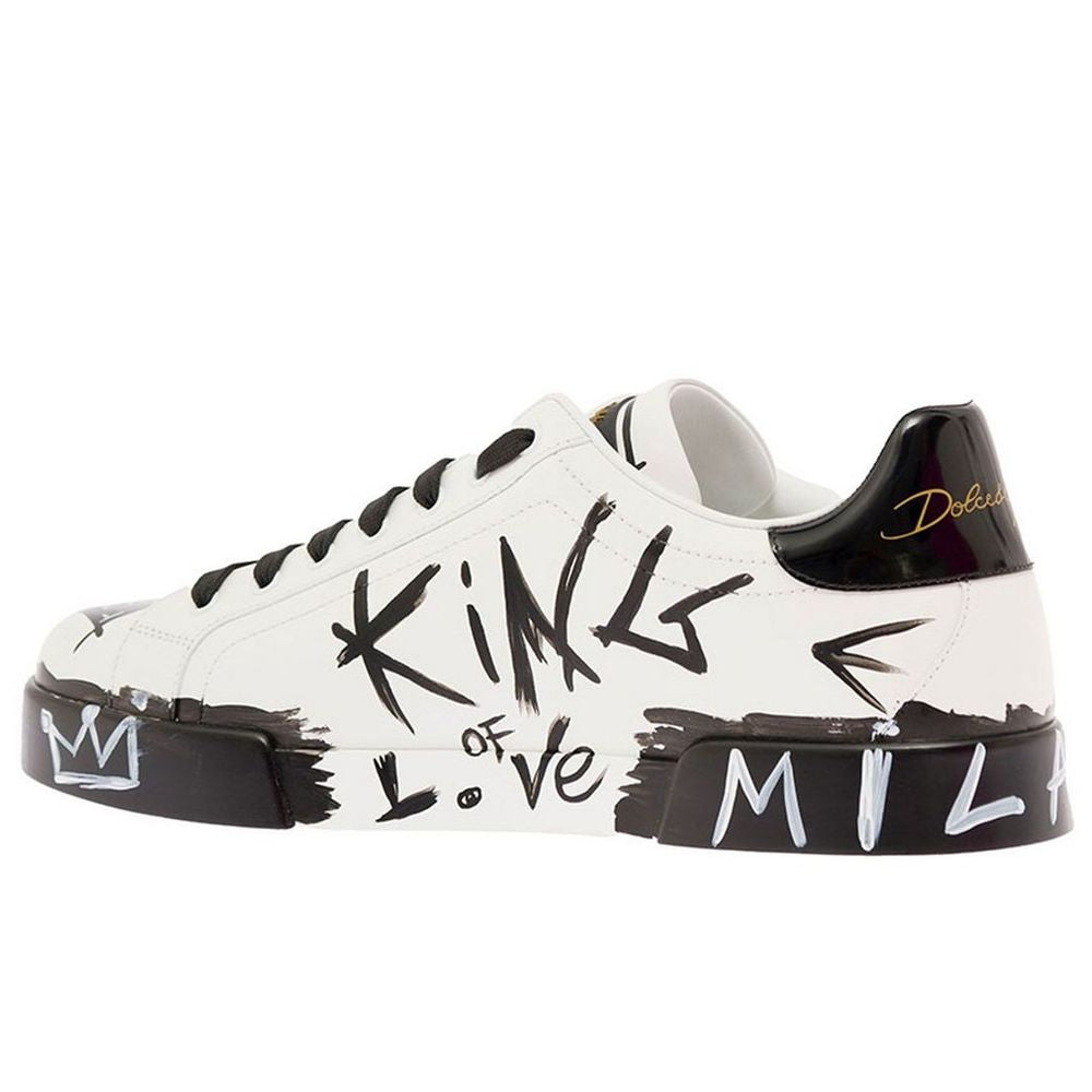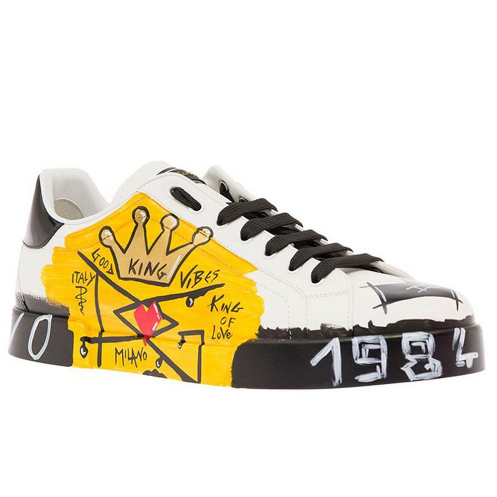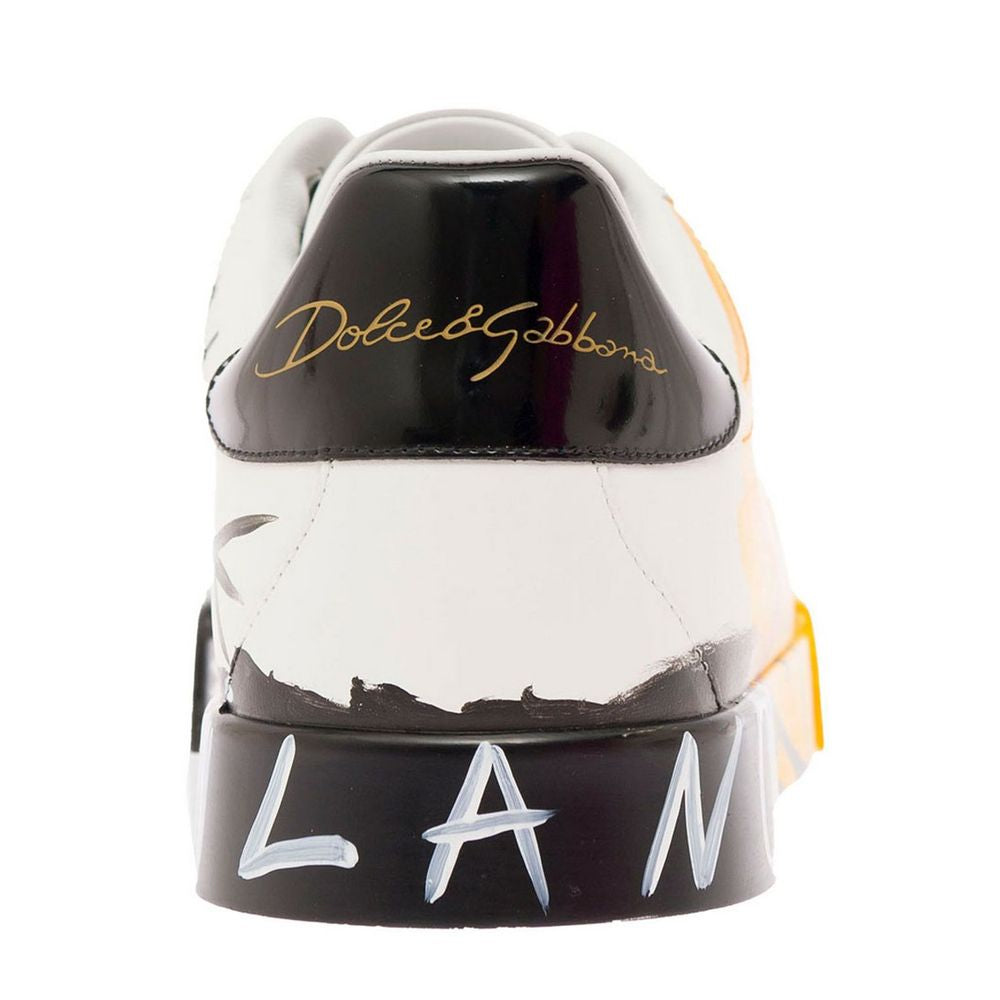 Dolce & Gabbana white calfskin sneaker with colorful marker decoration and lettering, black patent leather heel counter, rubber logo on tongue