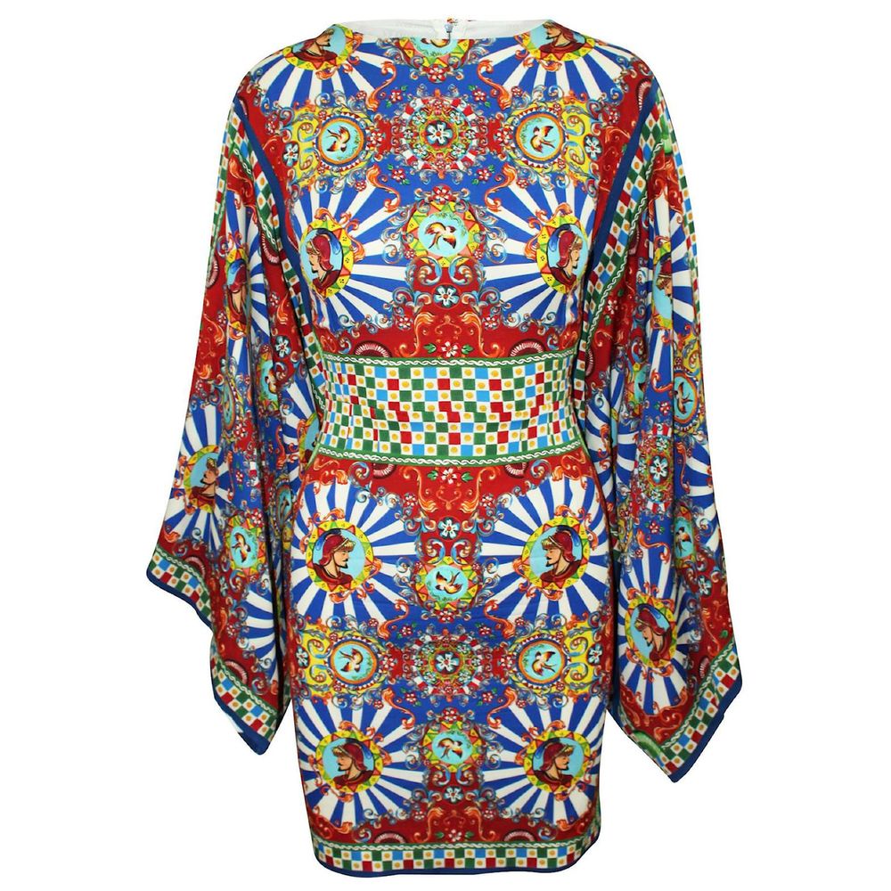 Dolce & Gabbana Carretto Siciliano print silk midi dress with asymmetric sleeves and crew neck, zip closure on the back.