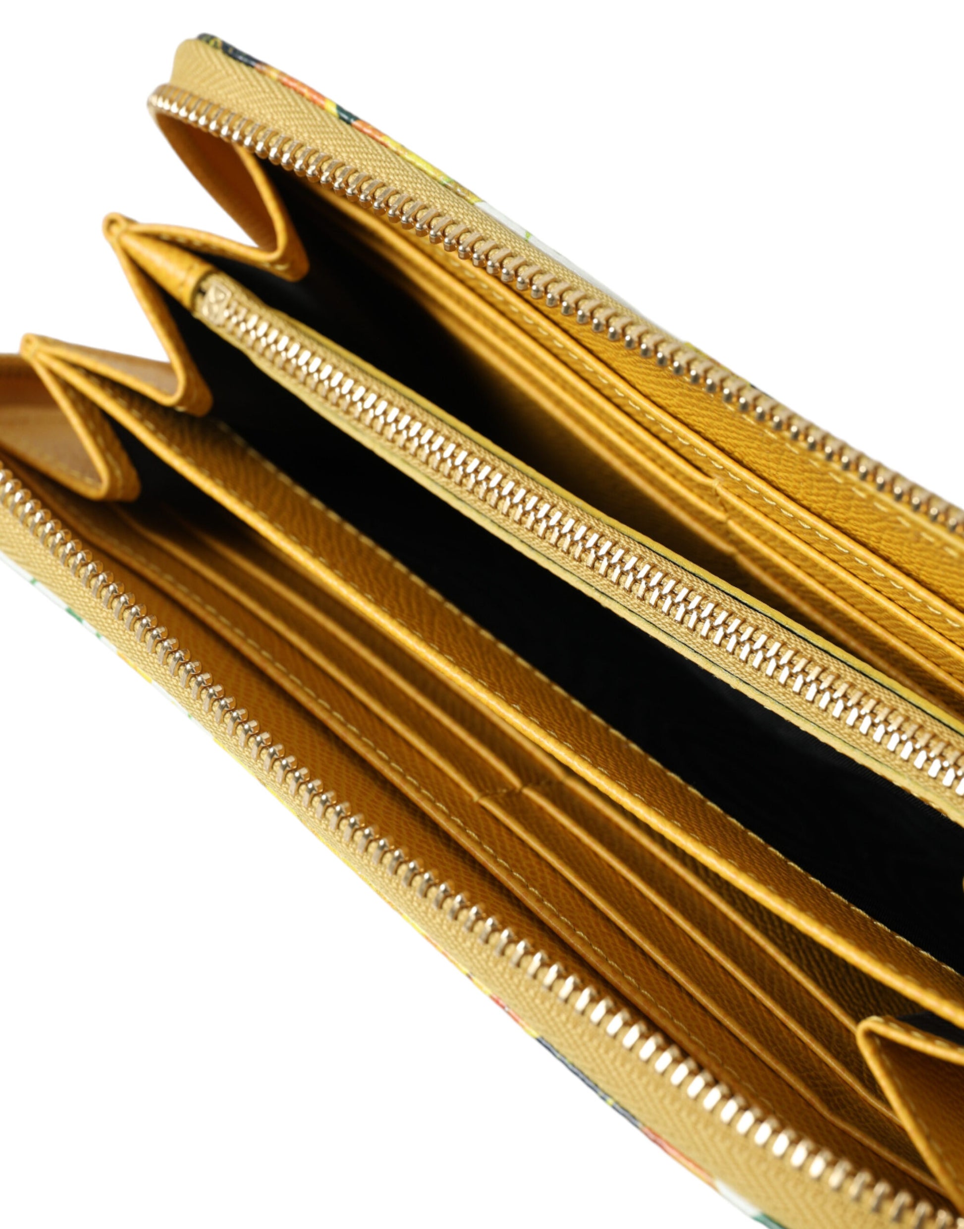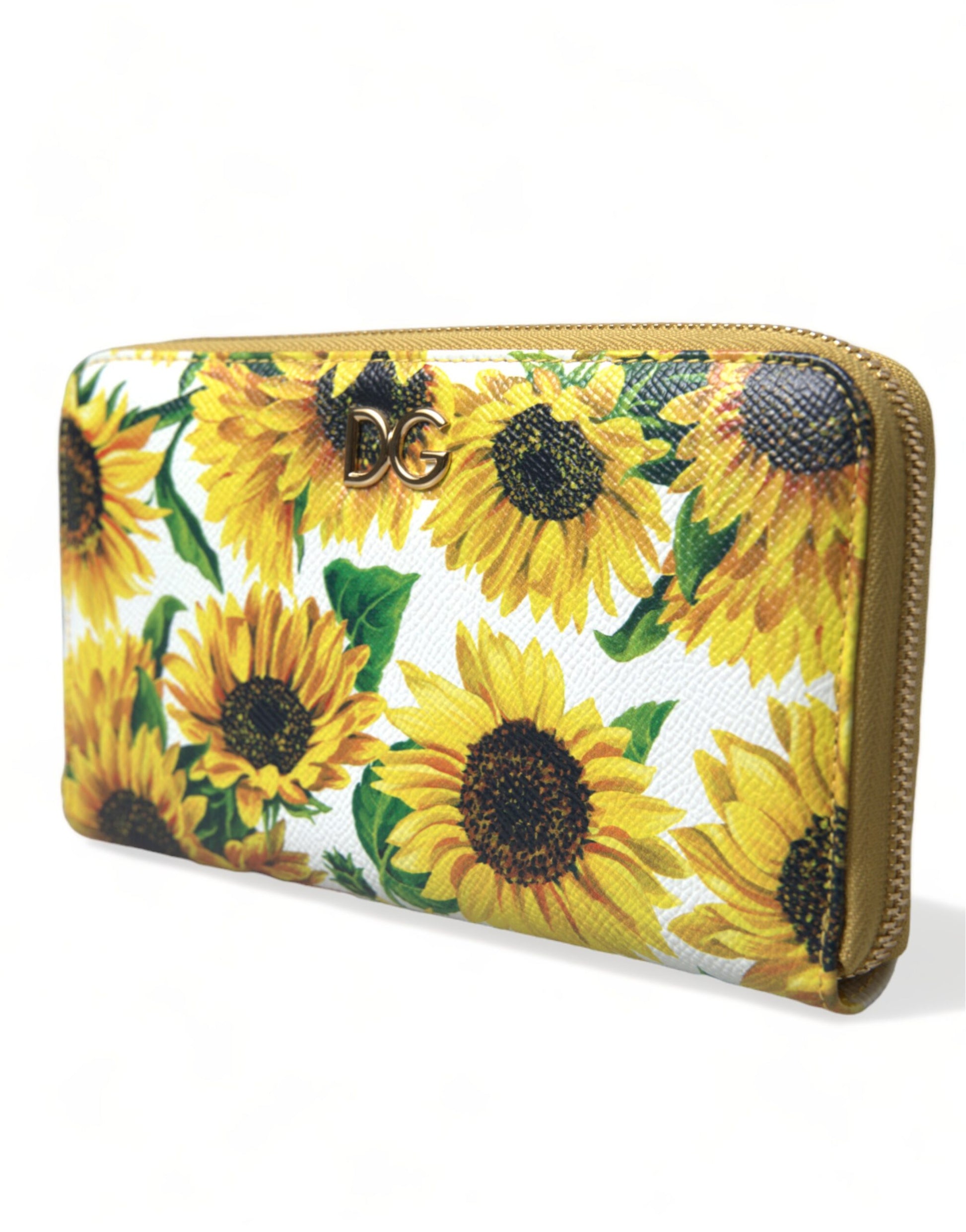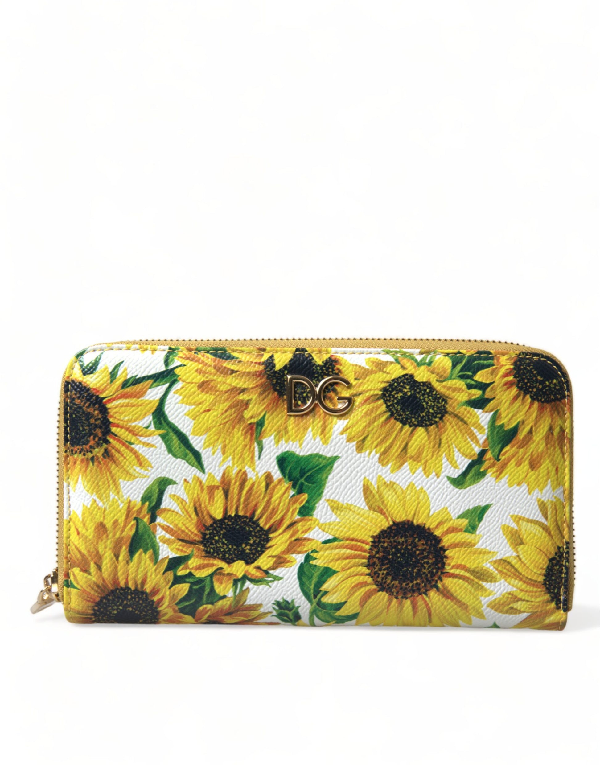 Discover the essence of sophistication with this stunning 100% Authentic Dolce & Gabbana leather continental wallet, featuring an enchanting sunflower print. The perfect blend of Italian craftsmanship and luxury, it comes with tags and original box, ready to be the centerpiece of your accessory collection. Adorned with lustrous gold metal details and a yellow inner lining, this wallet showcases a long zip-around design ensuring all your essentials stay secured in style.