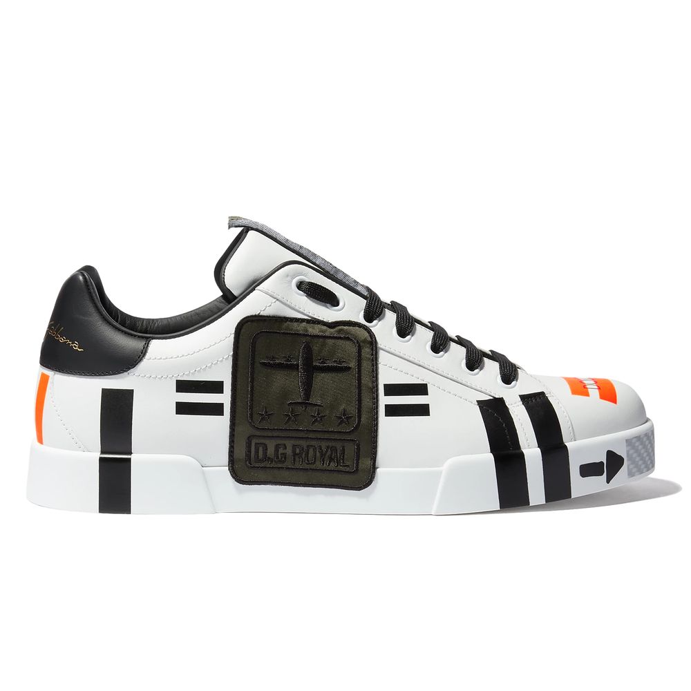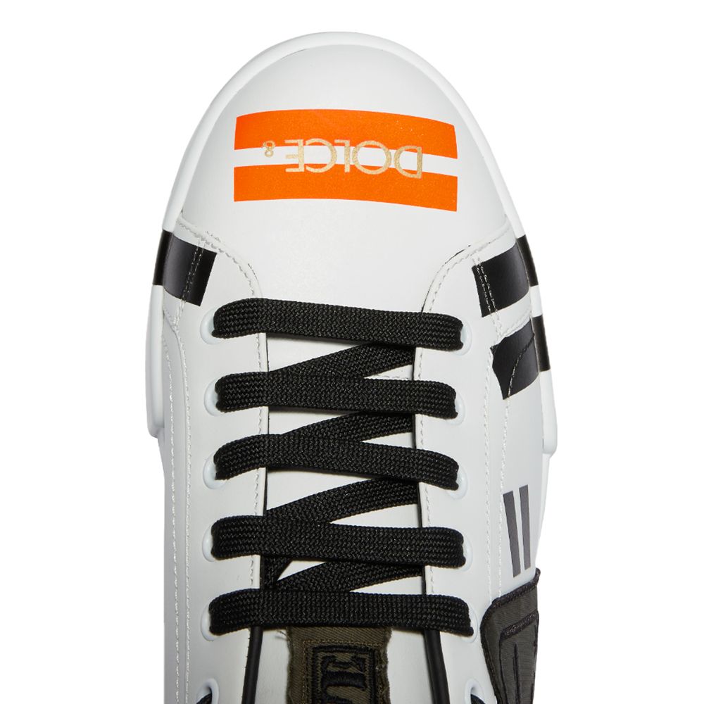 Dolce & Gabbana white calfskin sneakers with military-themed fabric patch appliqués, black and orange prints on sides, black leather heel counter with gold lettered logo