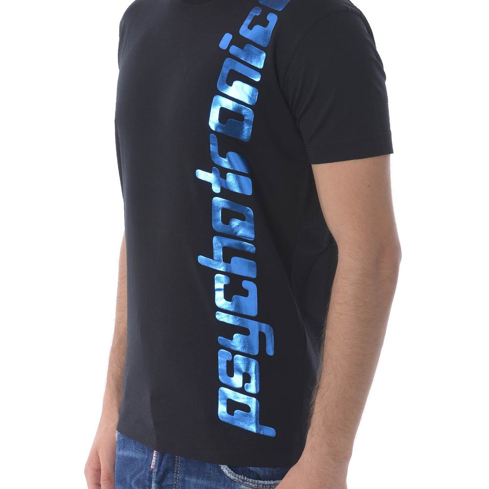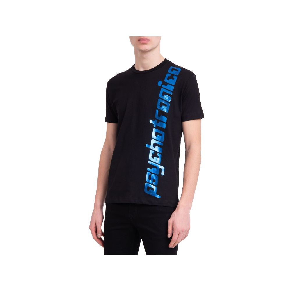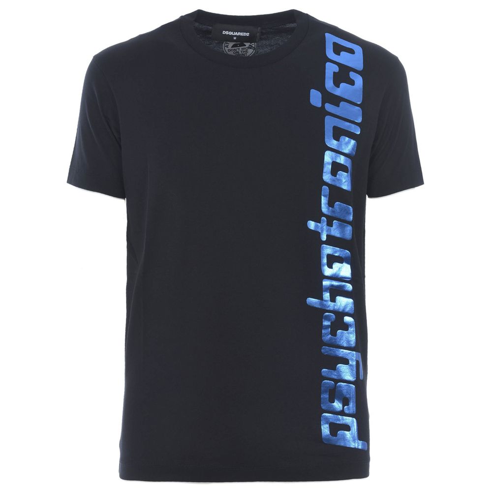 Exude casual sophistication with Dsquared²’s expertly crafted black cotton t-shirt for men. This piece features a striking bright blue vertical print on the front, paired with a discreet miniature logo print on the back, all presented in a classic crew neck design. Elegance and comfort are woven together in this Made in Italy essential.