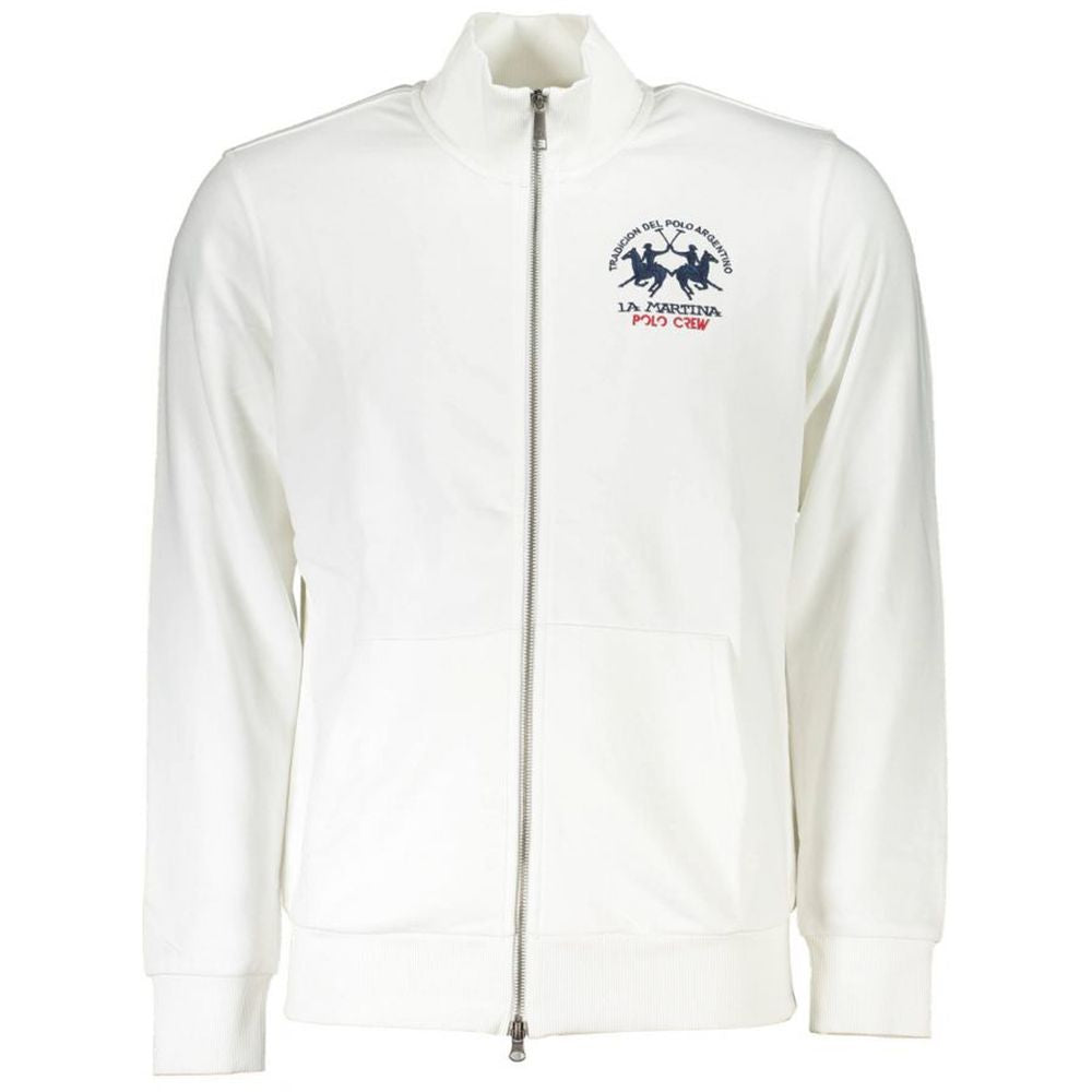 Embrace comfort and style with this sophisticated La Martina sweatshirt, crafted from a luxurious cotton blend. Featuring a convenient zip closure and practical front pockets, it is adorned with the iconic logo, intricately embroidered on the chest. Perfect for an effortlessly chic look.