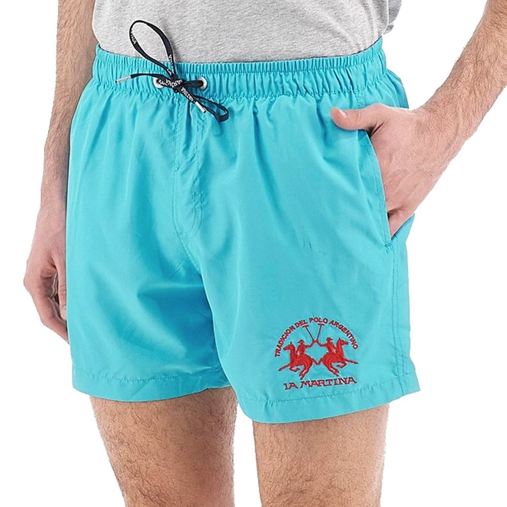 Dive into summer with sophistication in these La Martina men’s swim shorts. Crafted from 100% polyester for a quick-drying finish, they’re perfect for both in and out of the water activities. The adjustable drawstring waist ensures a snug fit while the pockets offer practicality for your essentials. The striking light blue hue complemented by the signature embroidered logo adds a touch of class to your swimwear wardrobe.