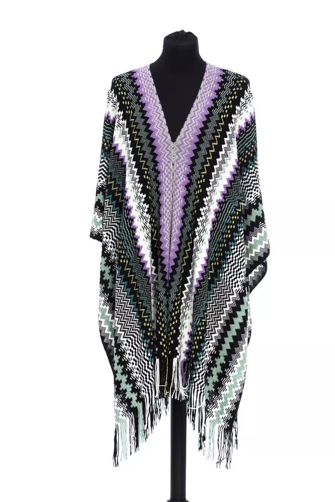Wrap yourself in the vibrant elegance of the Missoni Fringed Poncho, boasting a mesmerizing geometric pattern adorned with playful multicolor hues. Its luxurious composition drapes effortlessly, offering both warmth and high-fashion flair, ideal for enhancing any ensemble. The Italian craftsmanship shines through in every detail, from the sumptuous feel to the meticulous design. Dimensions ensure a flattering fit for supreme comfort and style.