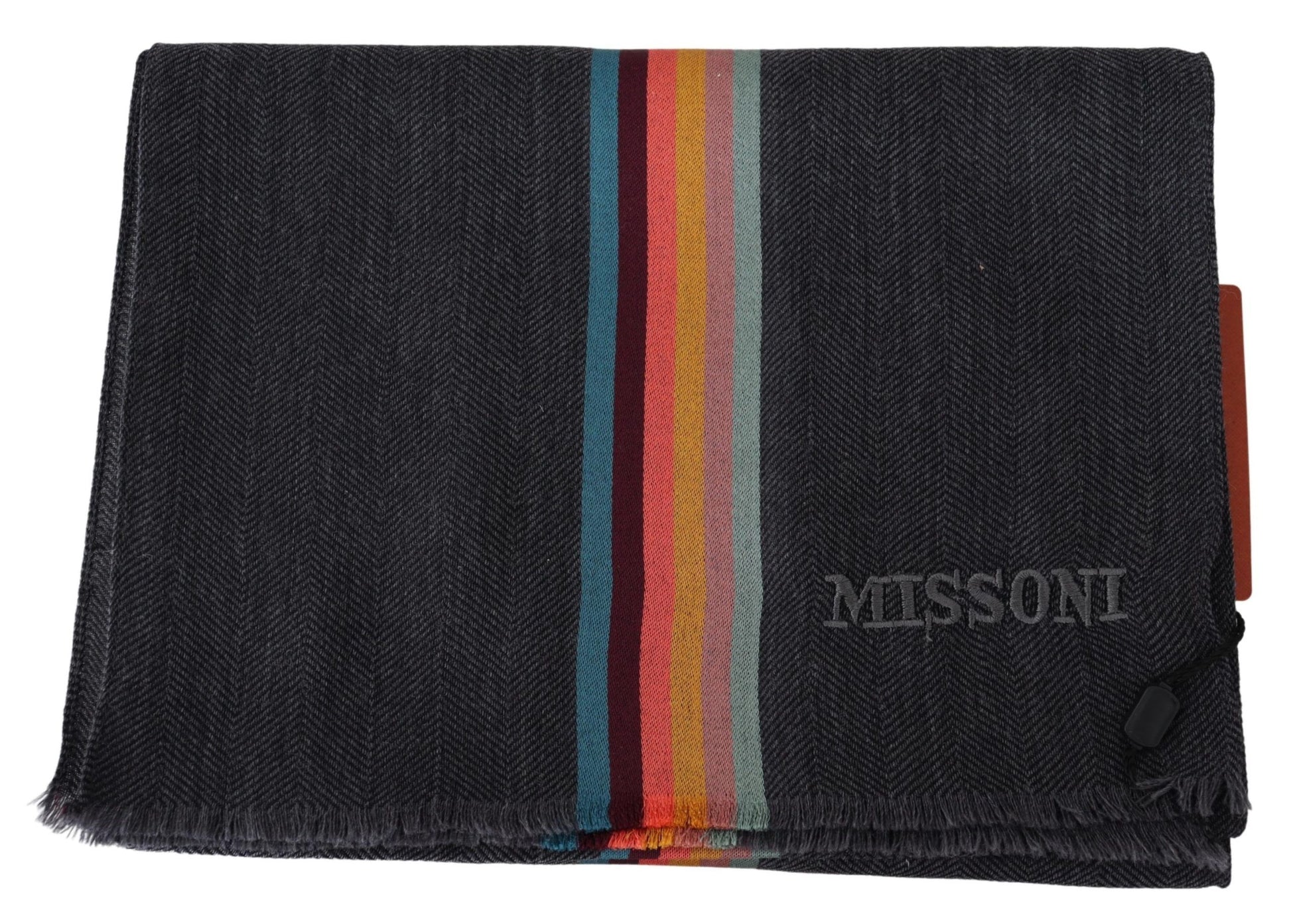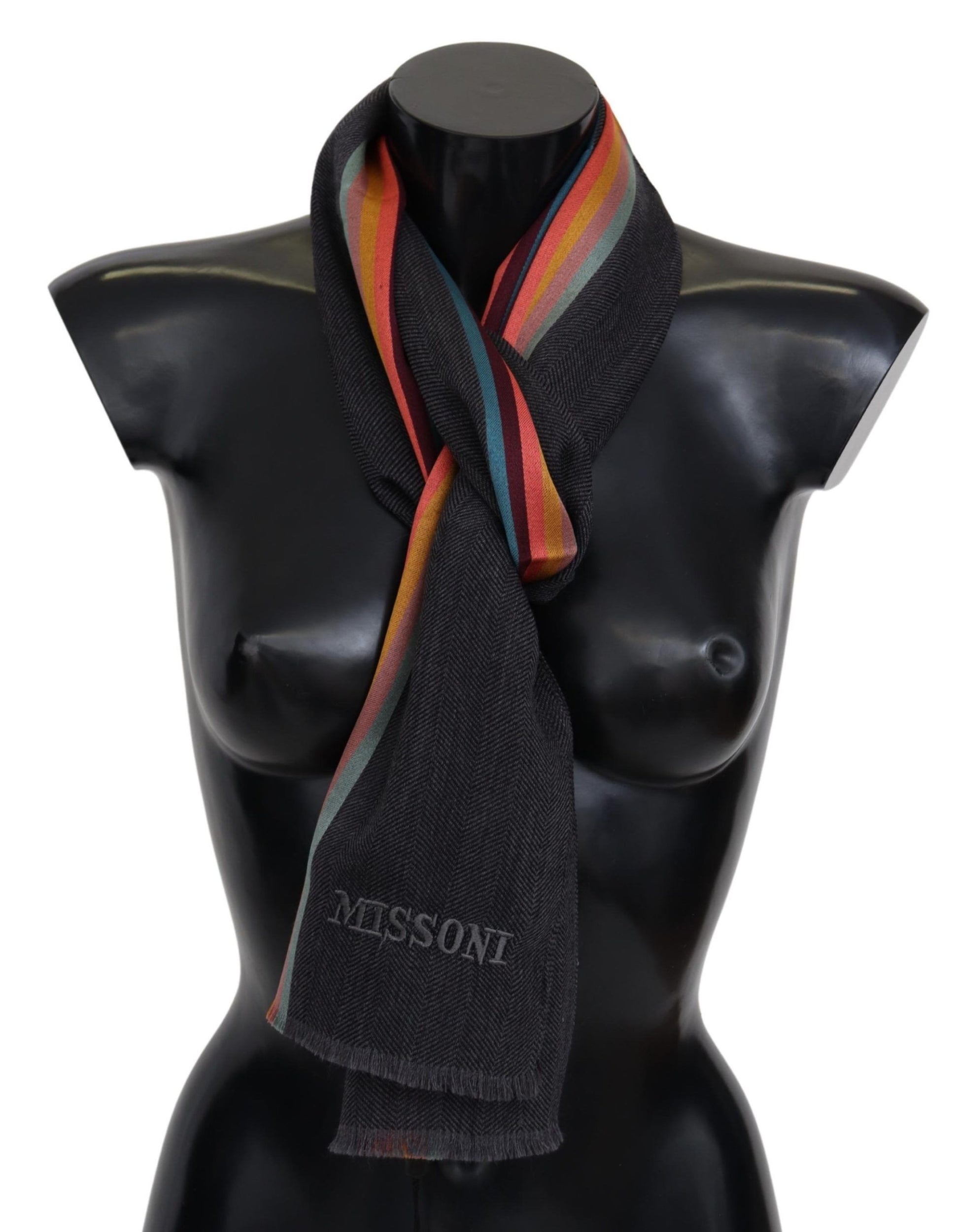 Experience the luxury of fine Italian craftsmanship with this Missoni wool-silk blend scarf. Boasting an opulent multicolor striped pattern and exquisite brand logo embroidery, this unisex scarf is an essential accessory for fashion connoisseurs. Elegantly finished with fringes, it promises to elevate your style and keep you warm.