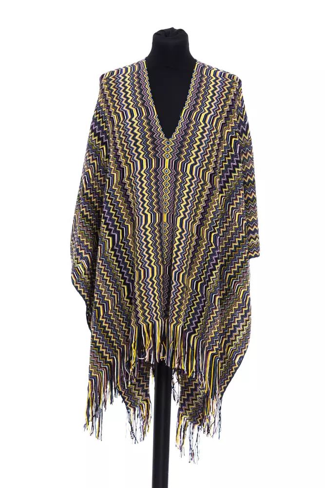 Wrap yourself in a kaleidoscope of colors with this Missoni fringed poncho. Showcasing a striking geometric fantasy pattern, this luxurious poncho offers both warmth and sartorial elegance. Its generous dimensions ensure a comfortable and stylish drape, making it the perfect statement piece for any fashion-forward wardrobe.
