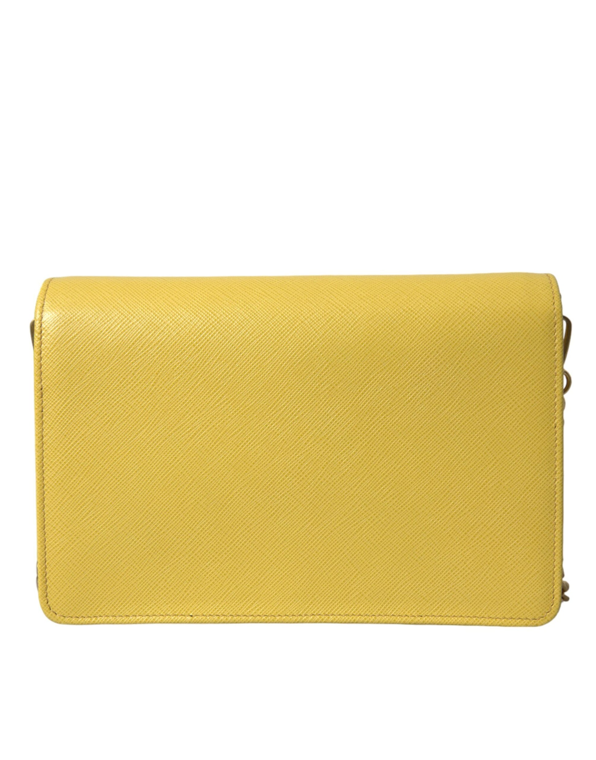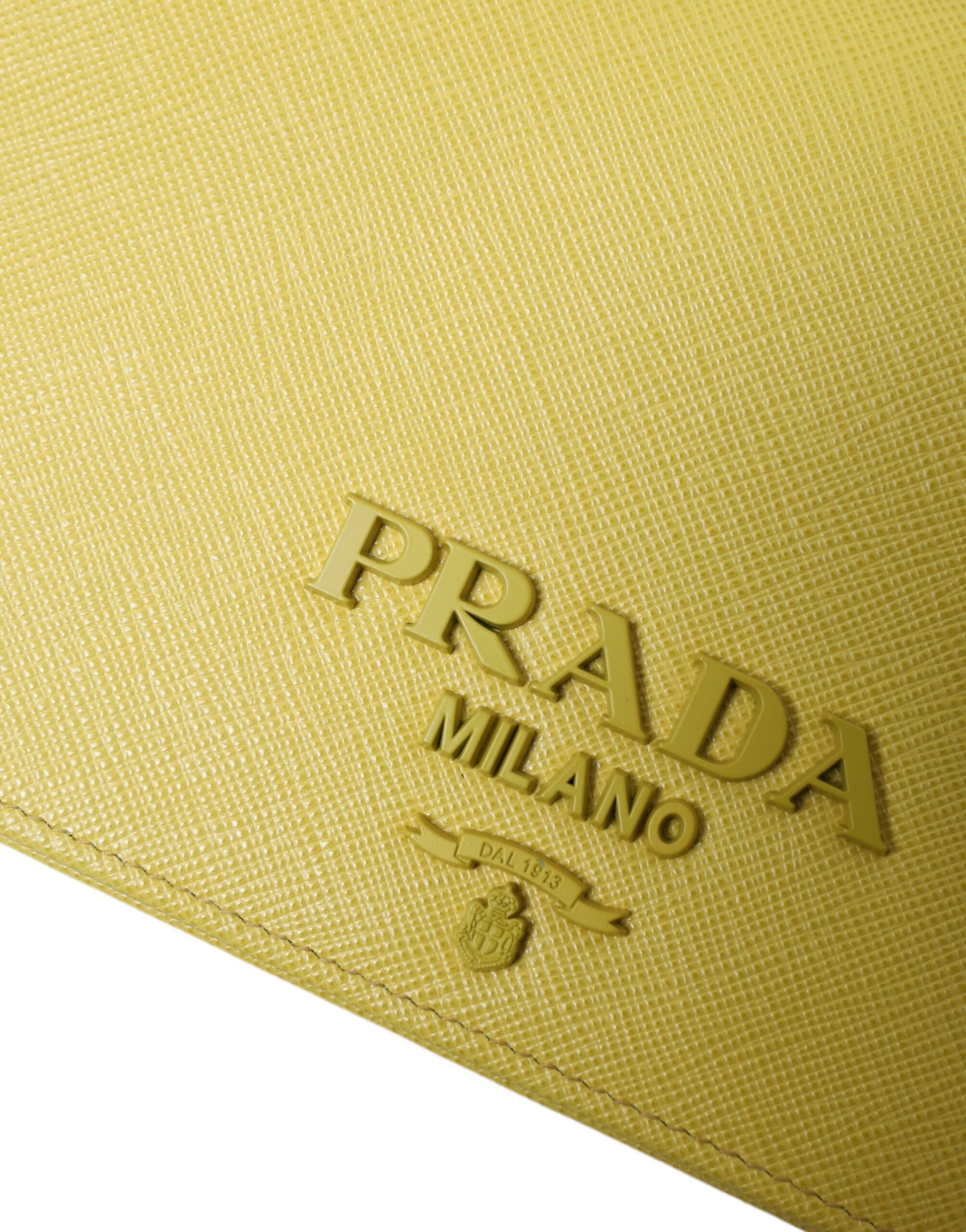 Experience luxury with this exquisite Prada Saffiano Leather Shoulder Bag, perfect for the fashion-forward individual. Crafted from fine leather with a sophisticated yellow hue, this chic shoulder bag features a secure magnetic closure and is adorned with the iconic logo for an unmistakable touch of class. Designed and made in Italy, its compact dimensions make it an ideal accessory for both day and evening outings.