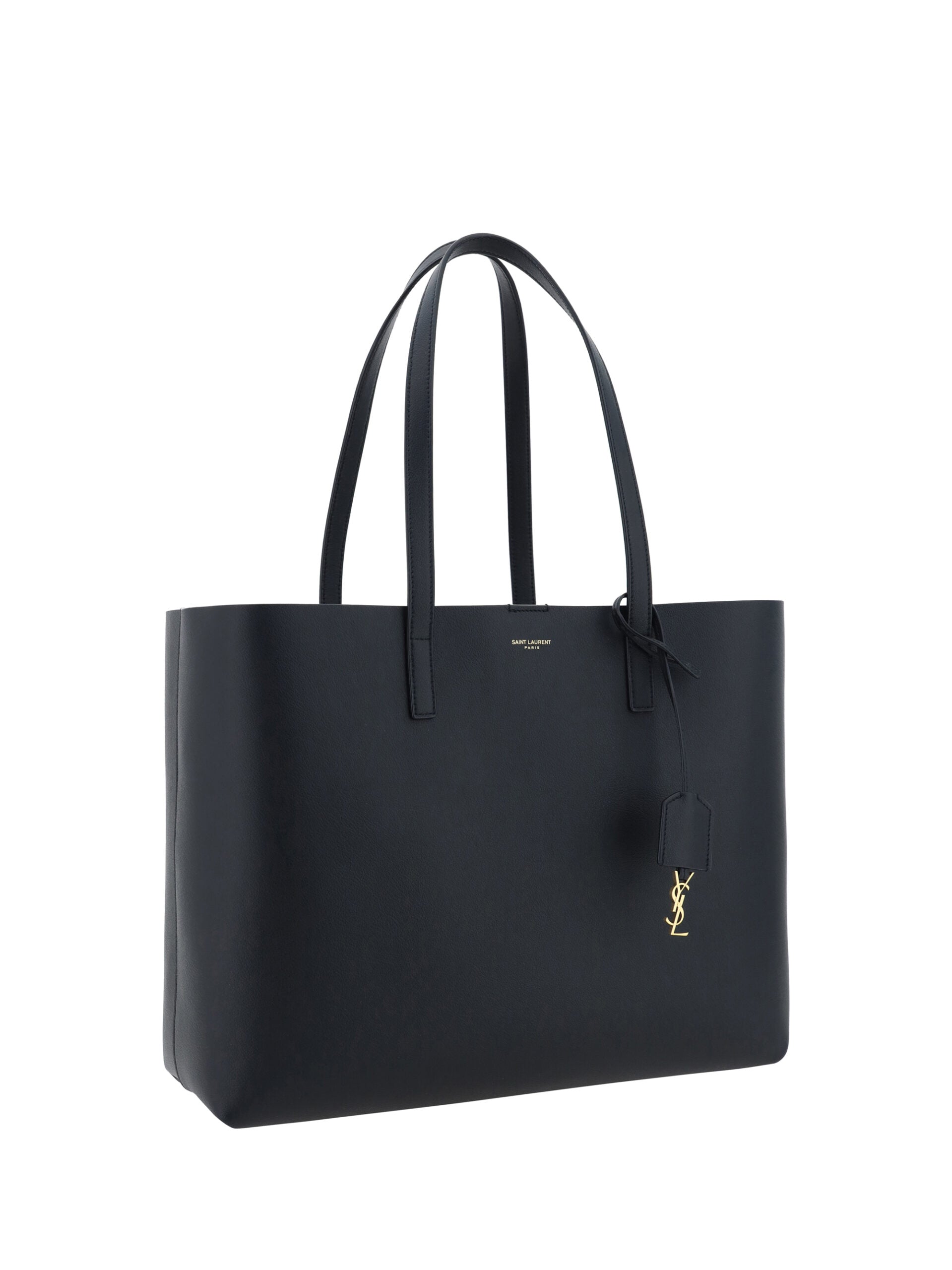 Details: Tote Shoulder Bag by Saint Laurent, double flat top handles, leather keychain detail applied at the base of the handle, iconic brand signature press-stamped on the front, interior magnetic closure, removable pouch inside the bag with zip closure.